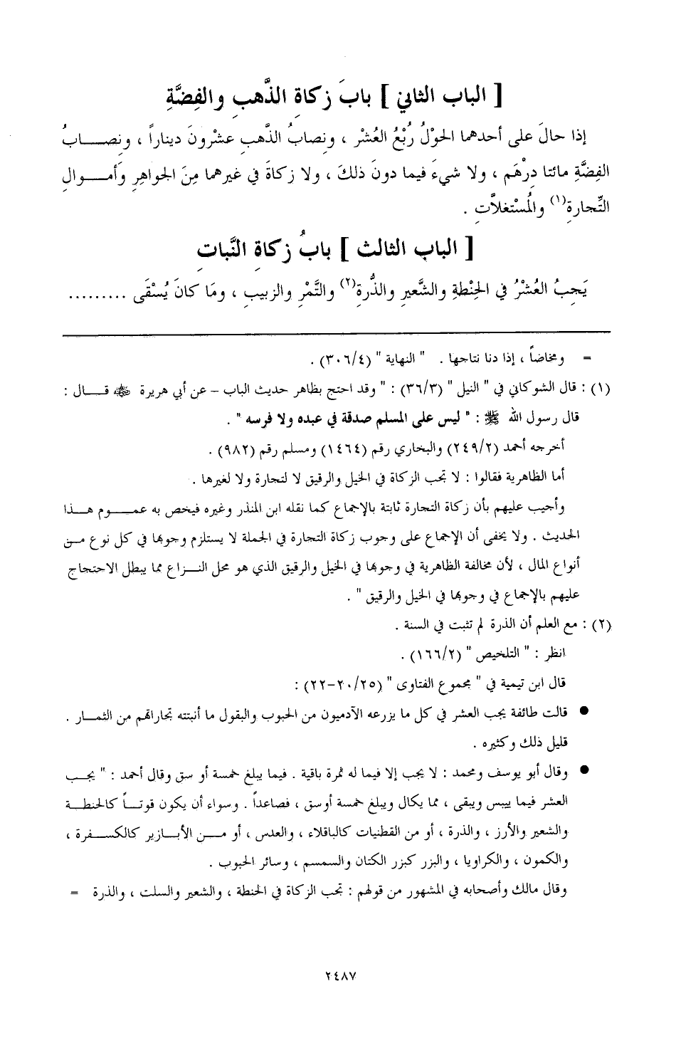 إذا حال على أحدهما الحول ربع العشر، ونصاب الذهب عشرون دينارًا، ونصاب الفضة مائتا درهم، ولا شيء فيما دون ذلك، ولا زكاة في غيرهما من الجواهر وأموال التجارة (¬1) والمستغلات.