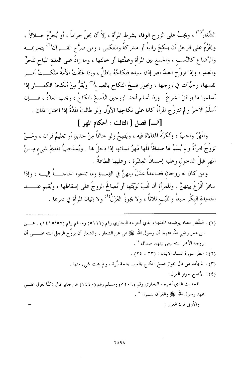 (¬1) الشغار معناه يوضحه الحديث الذي أخرجه البخاري رقم (5112) ومسلم رقم (57/ 1415). عن ابن عمر رضي الله عنهما أن رسول الله صَلَّى اللهُ عَلَيْهِ وَسَلَّمَ نهى عن الشغار، والشغار أن يزوج الرجل ابنته على أن يزوجه الآخر ابنته ليس بينهما صداق.