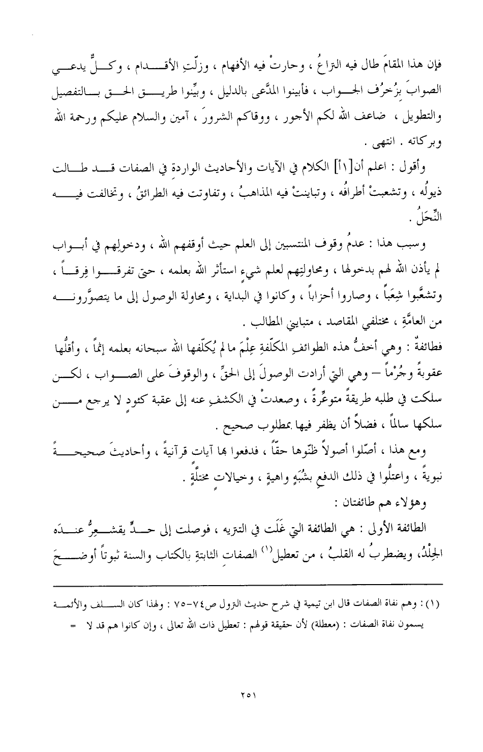 الطائفة الأولى: هي الطائفة التي غلت في التنزيه، فوصلت إلى حد يقشعر عنده الجلد، ويضطرب له القلب، من تعطيل (¬1) الصفات الثابتة بالكتاب والسنة ثبوتا أوضح