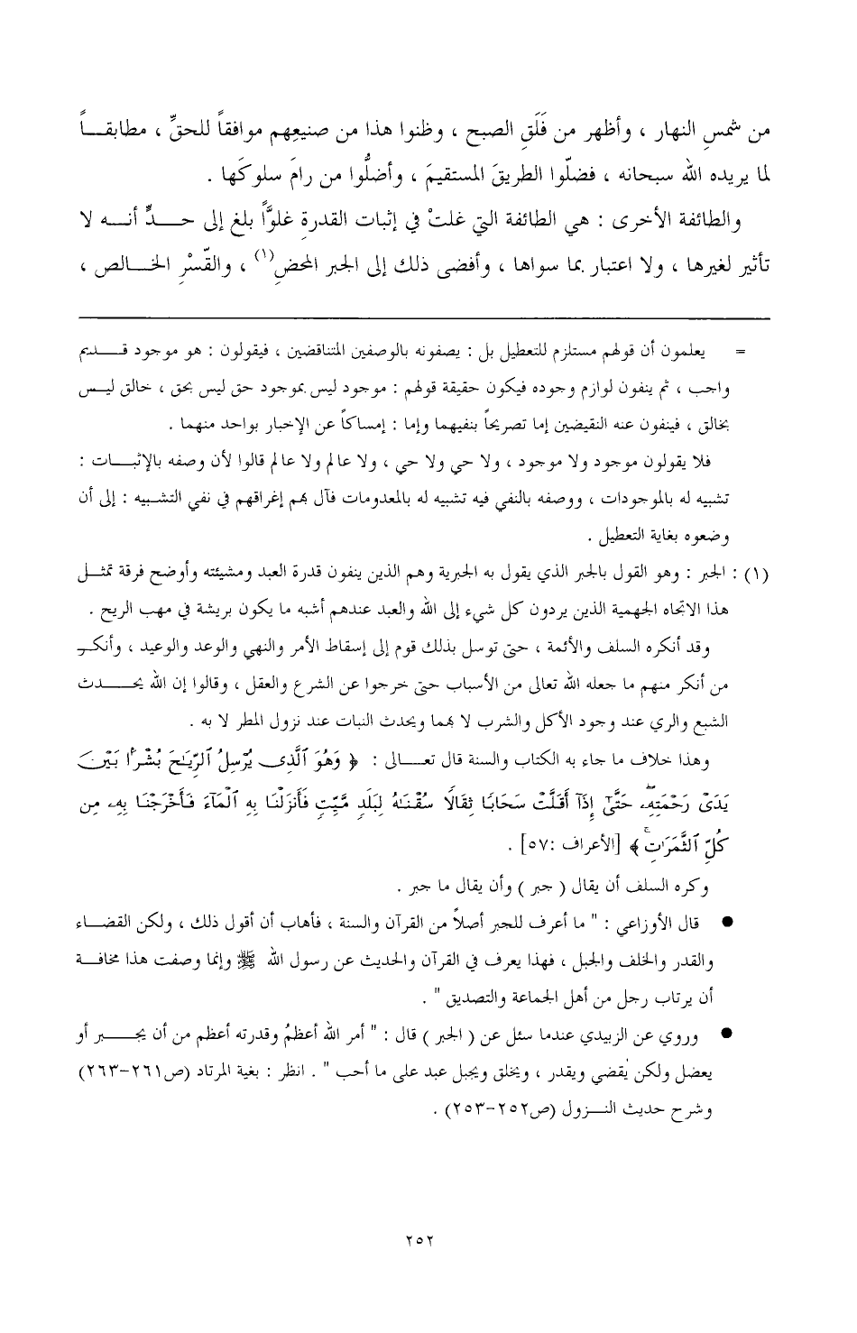 وروي عن الزبيدي عندما سئل عن (الجبر) قال: " أمر الله أعظم وقدرته أعظم من أن يجبر أو يعضل، ولكن يقضي ويقدر، ويخلق ويجبل عبد على ما أحب ". انظر: بغية المرتاد (ص 261 - 263) وشرح حديث النزول (ص 252 - 253).
