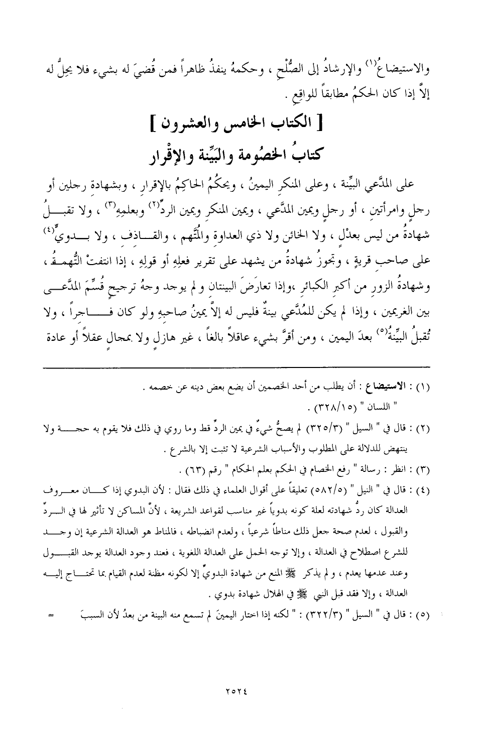 (¬5) قال في «السيل» (3/ 322): «لكنه إذا اختار اليمين لم تسمع منه البينة من بعد لأن السبب الشرعي المقتضي للحكم- وهو اليمين- قد وقع ووجب به وعلى الحاكم عند أن يسمع طلب المدعي ليمين المنكر أن يبين له أنه يأتي ببينة إذا كان له بينة قبل يمين خصمه وأنه إذا حلف خصمه لم تقبل البينة بعد ذلك. وليس هذا من التلقين للخصم، بل هو مما يلزم الحاكم ...