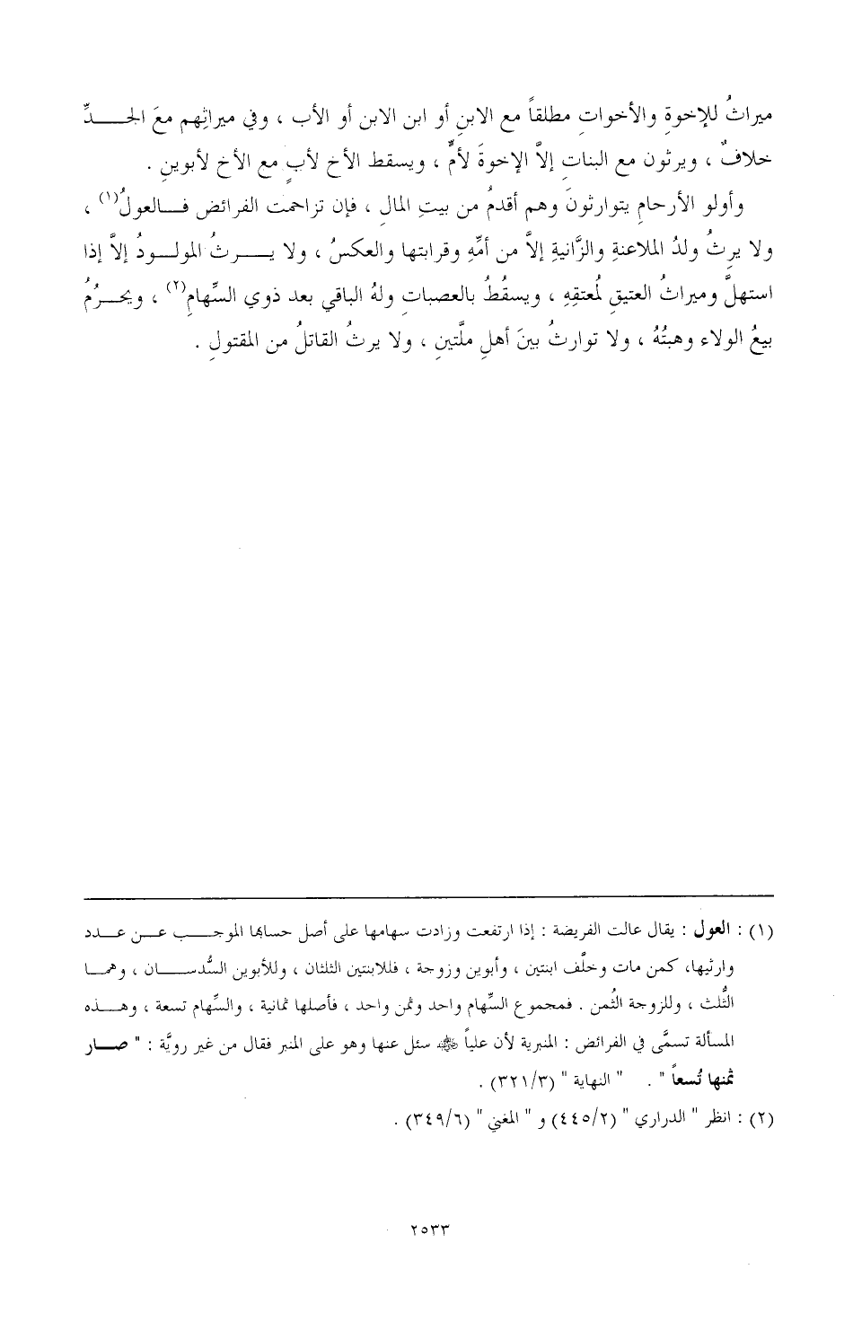 (¬1) العول: يقال: عالت الفريضة: إذا ارتفعت وزادت سهامها على أصل حسابها الموجب عن عدد وارثيها، كمن مات وخلف ابنتين، وأبوين وزوجة، فللابنتين الثلثان، وللأبوين السدسان، وهما الثلث، وللزوجة الثمن، فمجموع السام واحد وثمن واحد، فاصلها ثمانية، والسهام تسعة، وهذه المسألة تسمى في الفرائض: المنبرية؛ لأن عليًّا رضي الله عنه سئل عنها وهو على المنبر فقال من غير روية: «صار ثمنها تسعًا». «النهاية» (3/ 321).