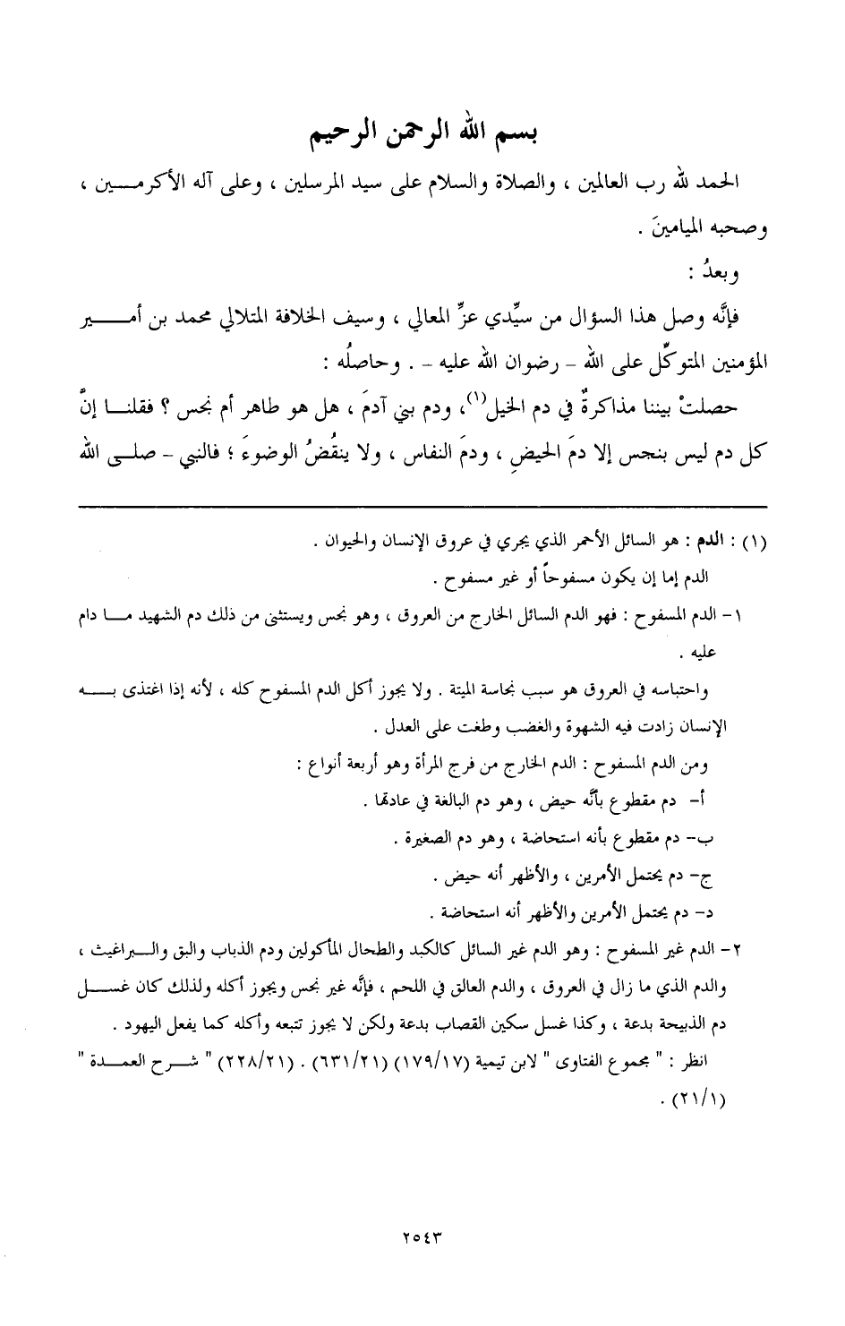 حصلت بيننا مذاكرة في دم الخيل (¬1)، ودم بني آدم، هل هو طاهر أم نجس؟ فقلنا: إن كل جم ليس بنجس إلا دم الحيض، ودم النفاس، ولا ينقض الوضوء؛ فالنبي- صلى الله