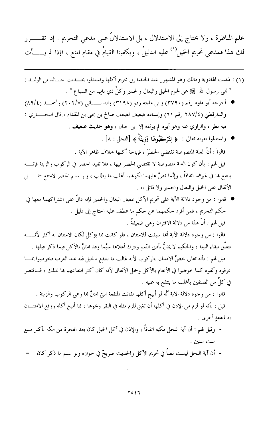 علم المناظرة، ولا يحتاج إلى الاستدلال، بل الاستدلال على مدعي التحريم. إذا تقرر لك هذا فمدعي تحريم الخيل (¬1) عليه الدليل، ويكفينا القيام في مقام المنع، فإذا لم يأت