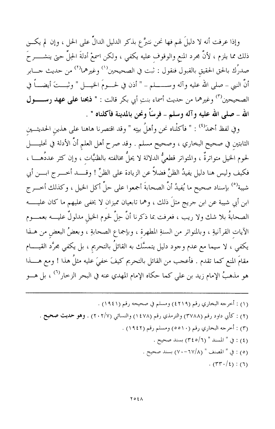 وفي لفظ أحمد (¬4): «فأكلناه نحن وأهل بيته «وقد اقتصرنا هاهنا على هذين الحديثين الثابتين في صحيح البخاري، والمتواتر قطعي الدلالة لا يحل مخالفته بالظنيات، وإن كثر عددها، فكيف وليس هنا دليل يفيد أن الصحابة أجمعوا على حل أكل الخيل، وكذلك أخرج ابن أبي شيبة (¬5) عن ابن جريج مثل ذلك، وهما تابعيان مميزان لا يخفى عليهم ما كان عليه الصحابة بلا شك ولا ريب، فعرفت بما ذكرنا أن حل لحوم الخيل مدلول عليه بعموم الآيات القرآنية، والمتواتر من السنة المطهرة، وبإجماع الصحابة، وبعض البعض من هذا يكفي، لا سيما مع عدم وجود دليل يتمسك به القائل بالتحريم، بل يكفي مجرد القيام مقام المنع كما تقدم، فأعجب من القائل بالتحريم كيف خفي ليه مثل هذا! ومع هذا هو مذهب الإمام زيد بن على كما حكاه الإمام الهدي عنه في البحر الزخار (¬6)، بل هو