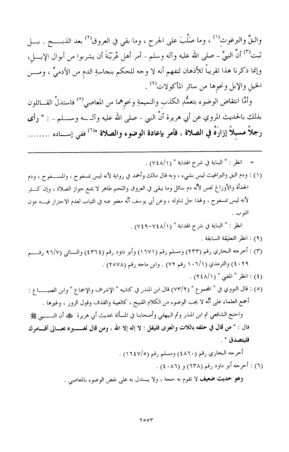 وأما انتقاض الوضوء بتعمد الكذب والنميمة ونحوهما من المعاصي (¬5) فاستدل القائلون بذلك الحديث المروي عن أبي هريرة أن النبي- صَلَّى اللهُ عَلَيْهِ وَآلِهِ وَسَلَّمَ-: «رأى رجلًا مسبلًا إزاره في الصلاة، فأمر بإعادة الوضوء والصلاة» (¬6) ففي إسناده ....................
