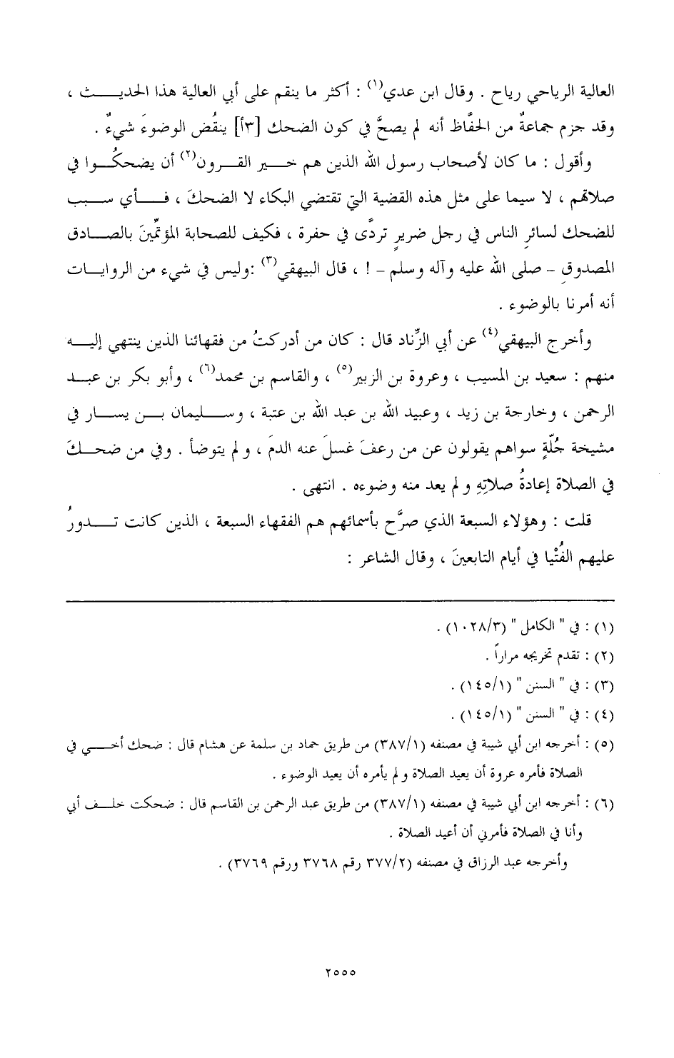 وأخرج البيهقي (¬4) عن أبي الزناد قال: كان من أدركت من فقهائنا الذين ينتهي إليه منهم: سعيد بن المسيب، وعروة بن الزبير (¬5)، والقاسم بن محمد (¬6)، وأبو بكر بن عبد الرحمن، وخارجة بن زيد، وعبيد الله بن عبد الله بن عتبة، وسليمان بن يسار في مشيخة جلة سواهم يقولون عن من رعف غسل عنه الدم، ولم يتوضأ. وفي من ضحك في الصلاة إعادة صلاته ولم يعد منه وضوءه. انتهى.