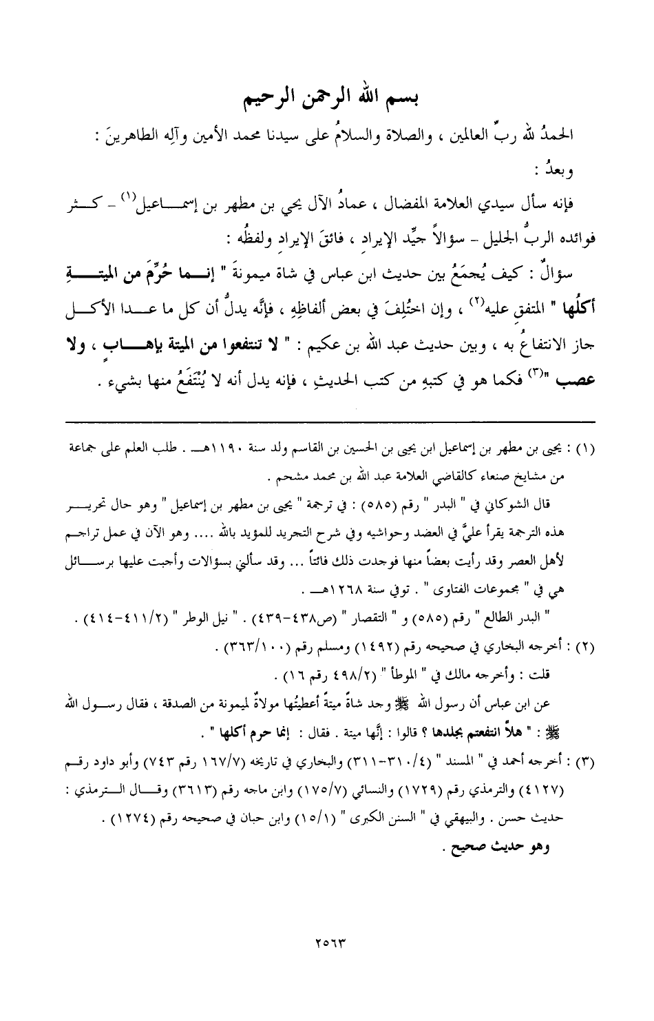 سؤال: كيف يجمع بين حديث ابن عباس في شاة ميمونة «إنما حرم من الميتة أكلها» المتفق عليه (¬2)، وإن اختلف في بعض ألفاظه، فإنه يدل أن كل ما عدا الأكل جاز الانتفاع به، وبين حديث عبد الله بن عكيم: «لا تنتفعوا من الميتة بإهاب، ولا عصب» (¬3) فكما هو كتبه من كتب الحديث، فإنه يدل أنه لا ينتفع منها بشيء.