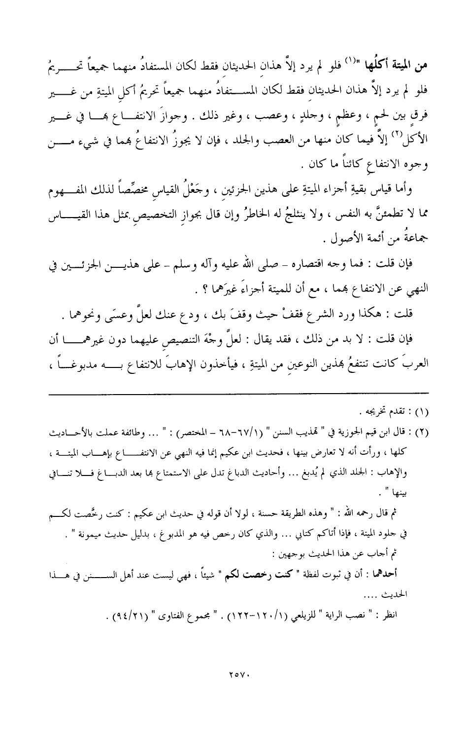 ثم قال رحمه الله: «وهذه الطريقة حسنة، لولا أن قوله في حديث ابن عكيم: كنت رخصت لكم في جلود الميتة، فإذا أتاكم كتابي ... والذي كان رخص فيه هو المدبوغ، بدليل حديث ميمونة».