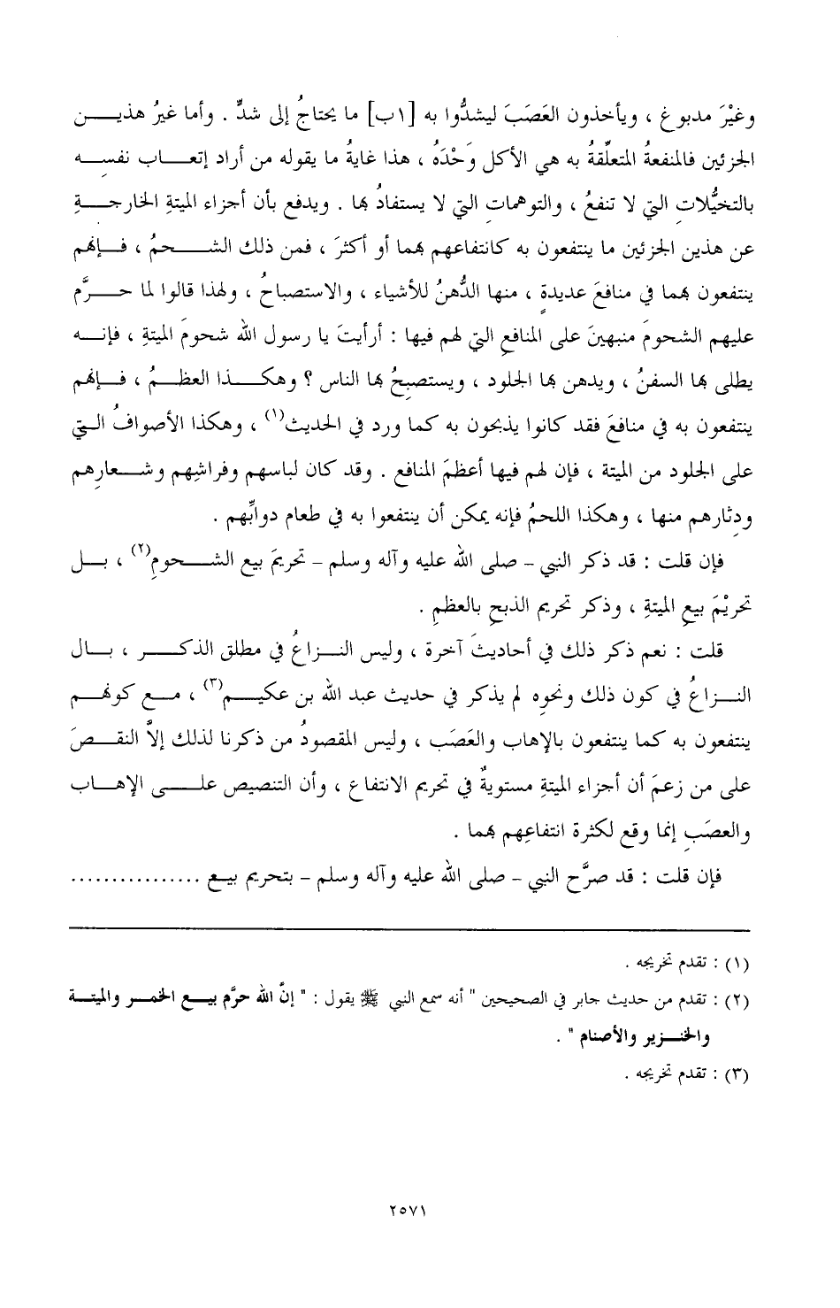وغير مدبوغ، ويأخذون الغصب ليشدوا به [1 ب] ما يحتاج إلى شد. وأما غير هذين الجزئين فالمنفعة المتعلقة به هي الأكل وحده، هذا غاية ما يقوله من أراد إتعاب نفسه بالتخيلات التي لا تنفع، والتوهمات لتي لا يستفاد بها. ويدفع بأن أجزاء الميتة الخارجة عن هذين الجزئين ما ينتفعون به كانتفاعهم بهما أو أكثر، فمن ذلك الشحم، فإنهم ينتفعون بهما في منافع عديدة، منها الدهن للأشياء، الاستصباح، ولها قالوا لما حرم عليهم الشحوم منبهين على المنافع التي لهم فيها: أرأيت يا رسول الله شحوم الميتة، فإنه يطلي بها السفن، ويدهن بها الجلود، ويستصبح بها الناس؟ وهكذا العظم، فإنهم ينتفعون به في منافع فقد كانوا يذبحون به كما ورد في الحديث (¬1)، وهكذا الأصواف التي على الجلود من الميتة، فإن لهم فيها أعظم المنافع. وقد كان لباسهم وشعارهم ودثارهم منها، وهكذا اللحم فإنه يمكن أن ينتفعوا به في طعام دوابهم.