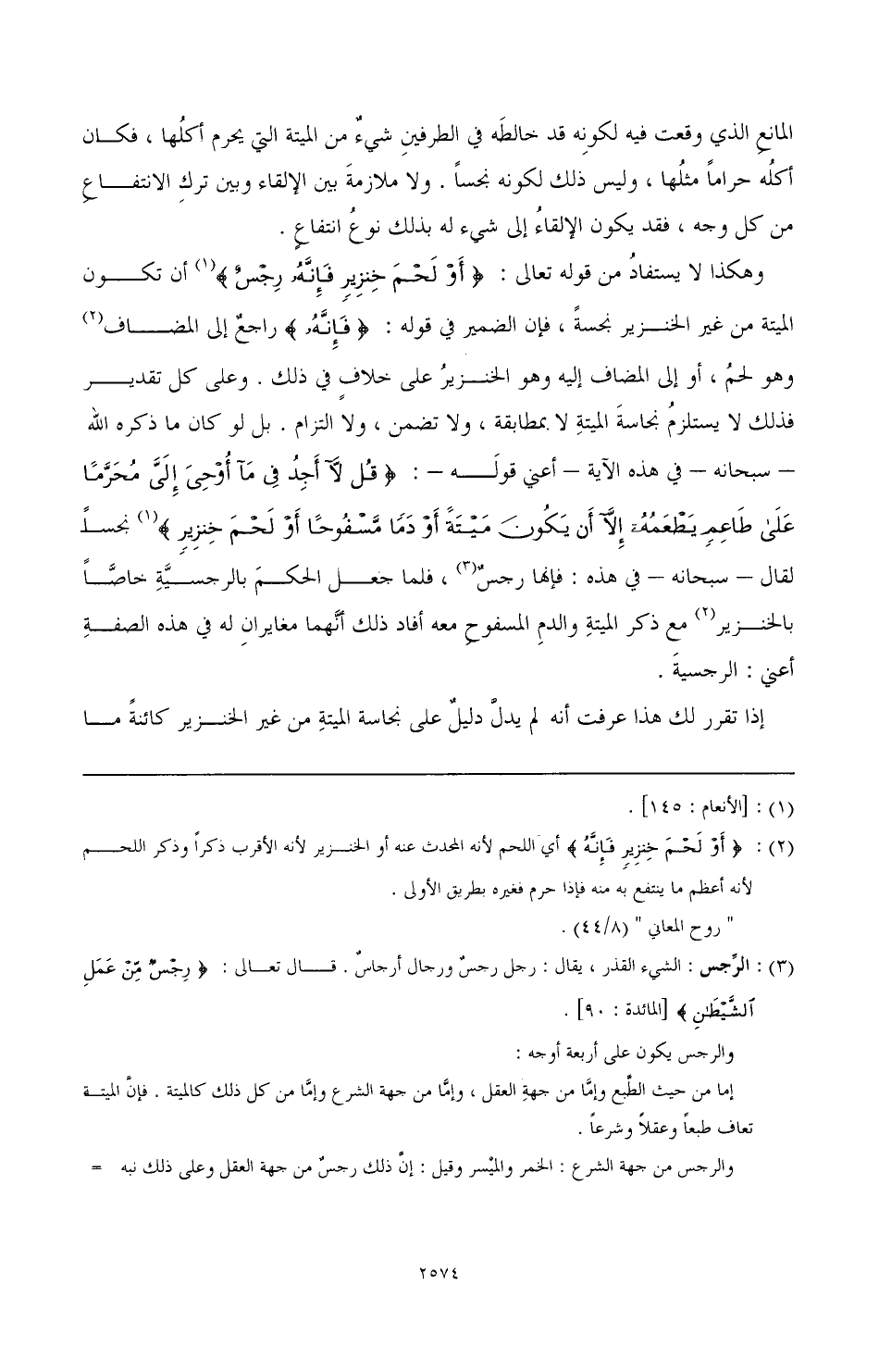 «مفردات ألفاظ القرآن» (ص342) للراغب الأصفهاني.، فلما جعل الحكم بالرجسية خاصًا بالخنزير (¬5) مع ذكر الميتة والدم المسفوح معه أفاد ذلك أنهما مغايران له في هذه الصفة أعني: الرجسية.