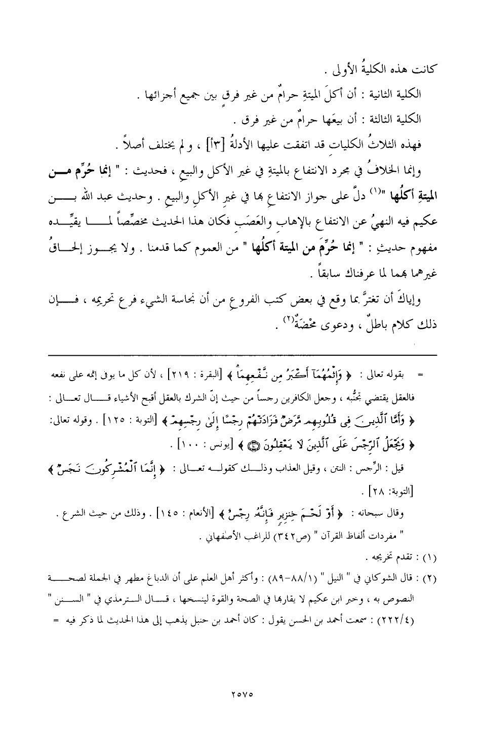 وإياك أن تغتر بما وقع في بعض كتب الفروع من أن نجاسة الشيء فرع تحريمه، فإن ذلك كلام باطل، ودعوى محضة (¬2)