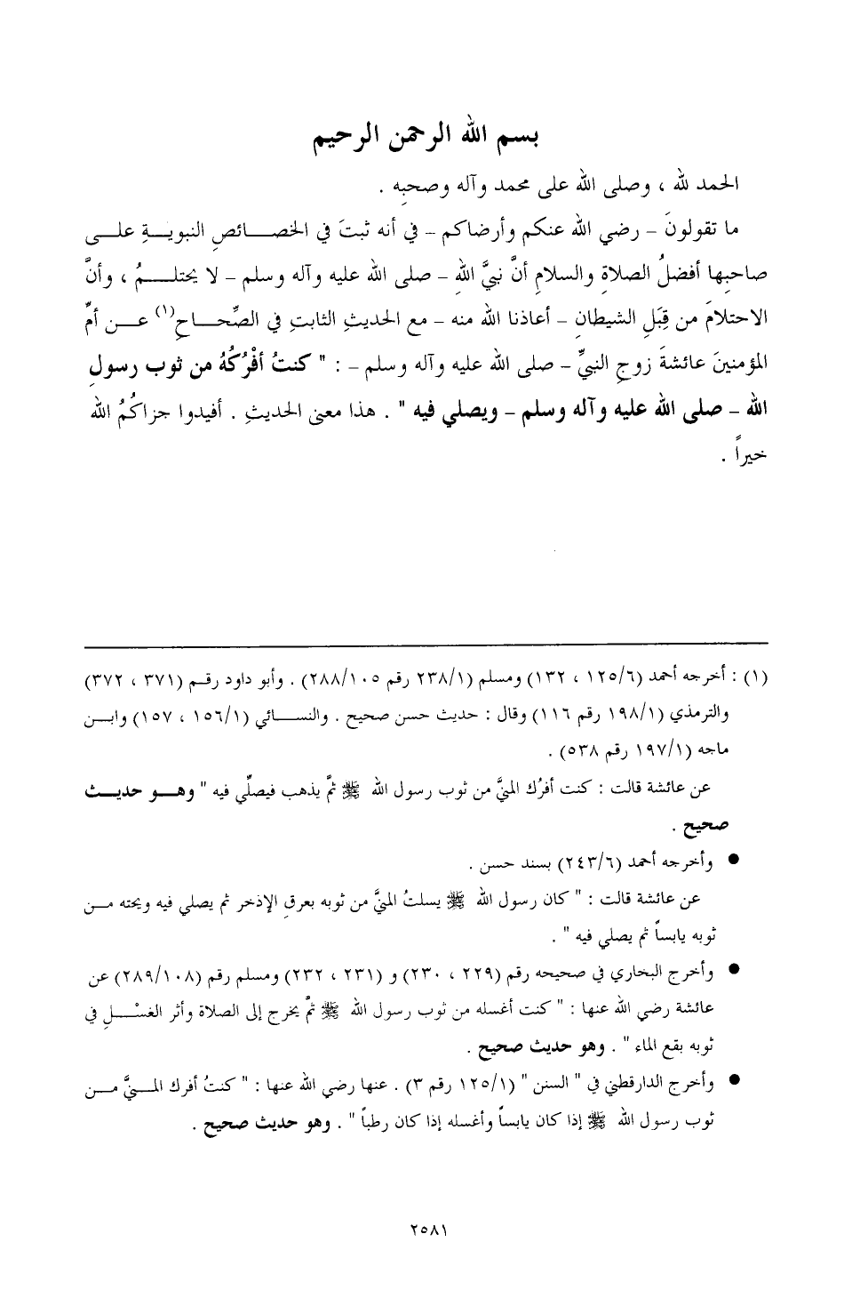ما تقولون- رضي الله عنكم وأرضاكم- في أنه ثبت في الخصائص النبوية على صاحبها أفضل الصلاة والسلام أن نبي الله- صَلَّى اللهُ عَلَيْهِ وَآلِهِ وَسَلَّمَ- لا يحتلم، وأن الاحتلام من قبل الشيطان- أعاذنا الله منه- مع الحديث الثابت في الصحاح (¬1) عن أم المؤمنين عائشة زوج النبي- صَلَّى اللهُ عَلَيْهِ وَآلِهِ وَسَلَّمَ-: «كنت أفركه من ثوب رسول الله- صَلَّى اللهُ عَلَيْهِ وَآلِهِ وَسَلَّمَ- ويصلي فيه». هذا معنى الحديث. أفيدوا جزاكم الله خيرًا.