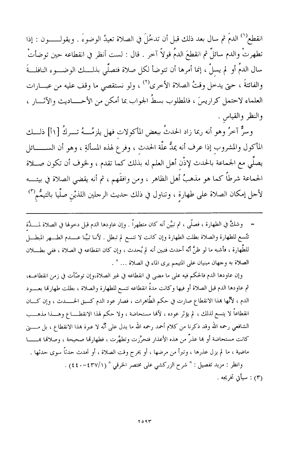 وسر آخر وهو أنه ربما زاد الحدث ببعض المأكولات فهل يلزمه ترك [1 أ] ذلك المأكول والمشروب إذا عرف أنه يمد علة الحدث، وفرع لهذه المسألة، وهو أن السائل يصلي مع الجماعة بالحدث لإذن أهل العلم له بذلك كما تقدم، ولخوف أن تكون صلاة الجماعة شرطًا كما هو مذهب أهل الظاهر، ومن وافقهم، ثم أنه يقضي الصلاة في بيته لأجل إمكان الصلاة على طهارة، وتناول في ذلك حديث الرجلين اللذين صليا بالتيمم (¬3)