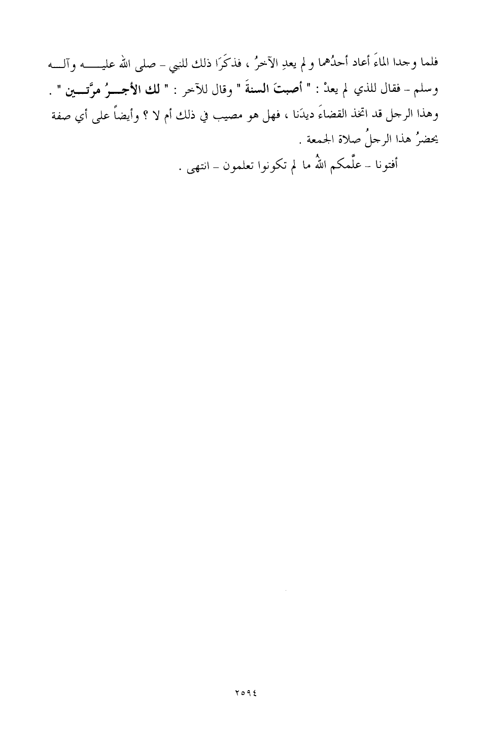 فلما وجد الماء أعاد أحدهما ولم يعد الآخر، فذكرا ذلك للنبي- صَلَّى اللهُ عَلَيْهِ وَآلِهِ وَسَلَّمَ- فقال للذي لم يعد: «أصبت السنة» وقال للآخر: «لك الأجر مرتين». وهذا الرجل قد اتخذ القضاء دينًا، فهل هو مصيب في ذلك أم لا؟ وأيضًا على أي صفة يحضر هذا الرجل صلاة الجمعة.