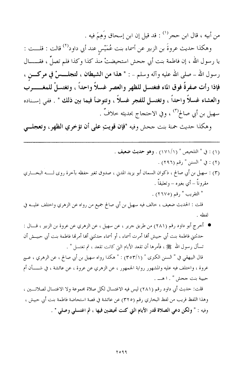 وهكذا حديث عروة بن الزبير عن أسماء بنت عميس عند أبي داود (¬2) قالت: قلت: يا رسول الله، إن فاطمة بنت أبي جحش استحيضت منذ كذا وكذا فلم تصل، فقال رسول الله- صَلَّى اللهُ عَلَيْهِ وَآلِهِ وَسَلَّمَ-: «هذا من الشيطان، لتجلس في مركن، فإذا رأت صفرة فوق الماء فتغتسل للظهر والعصر غسلًا واحدًا، وتغتسل للمغرب والعشاء غسلًا واحدًا، وتغتسل للفجر غسلًا، وتتوضأ فيما بين ذلك». ففي إسناده سهيل بن أبي صالح (¬3)، وفي الاحتجاج بحديثه خلاف.