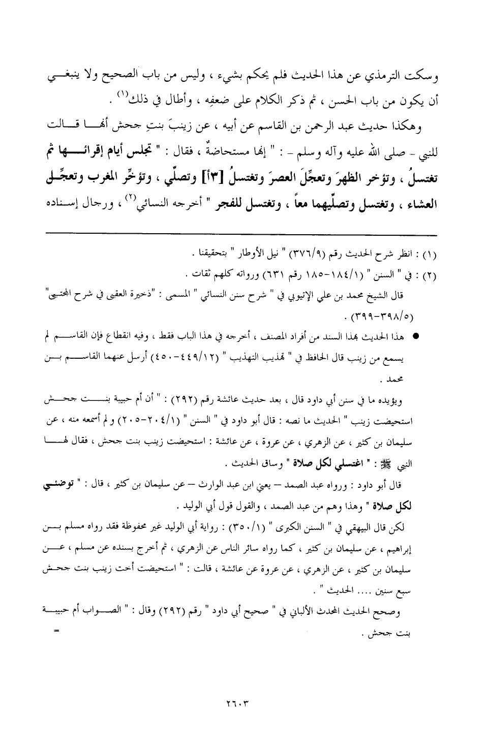 ويؤيده ما سنن أبي داود قال: بعد حديث عائشة (292): «أن أم حبيبة بنت جحش استحيضت زينب» حديث فريضه: قال أبو داود في «السنن» (1/ 204 - 205) ولم أسمعه منه، عن سليمان بن كثير، عن الزهري، عن عروة، عن عائشة: استحيضت زينب بنت جحش، فقال لها النبي صَلَّى اللهُ عَلَيْهِ وَسَلَّمَ: «إغتسلي لكل صلاة» وساق الحديث.