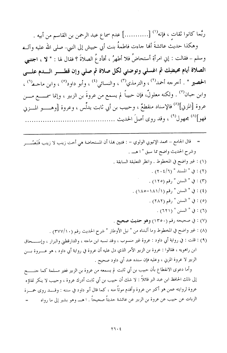 وهكذا حديث عائشة أنها جائت فاطمة بنت أبي حبيش إلى النبي- صَلَّى اللهُ عَلَيْهِ وَآلِهِ وَسَلَّمَ- فقالت: إني أمراة أستحاض فلا أطهر، أفأدع الصلاة؟ فقال لها: «لا، اجتنبي الصلاة أيام محيضك ثم اغتسلي ثم توضئي لكل صلاة ثم صلى وإن قطر الدم على الحصير». أخرجه أحمد (¬2)، والترمذي (¬3)، والنسائي (¬4)، وأبو داود (¬5)، وأبن ماجة (¬6)، وابن حبان (¬7). ولكنه معلول، فإن حبيبًا لم يسمع من عروة بن الزبير، وإنما سمع من عروة [المزني] (¬8) فالإسناد منقطع، وحبيب بن أبي ثابت يدلس، وعروة [وهو المزني فهو] (¬9) مجهول (¬10)، وقد روى أصل الحديث .....................