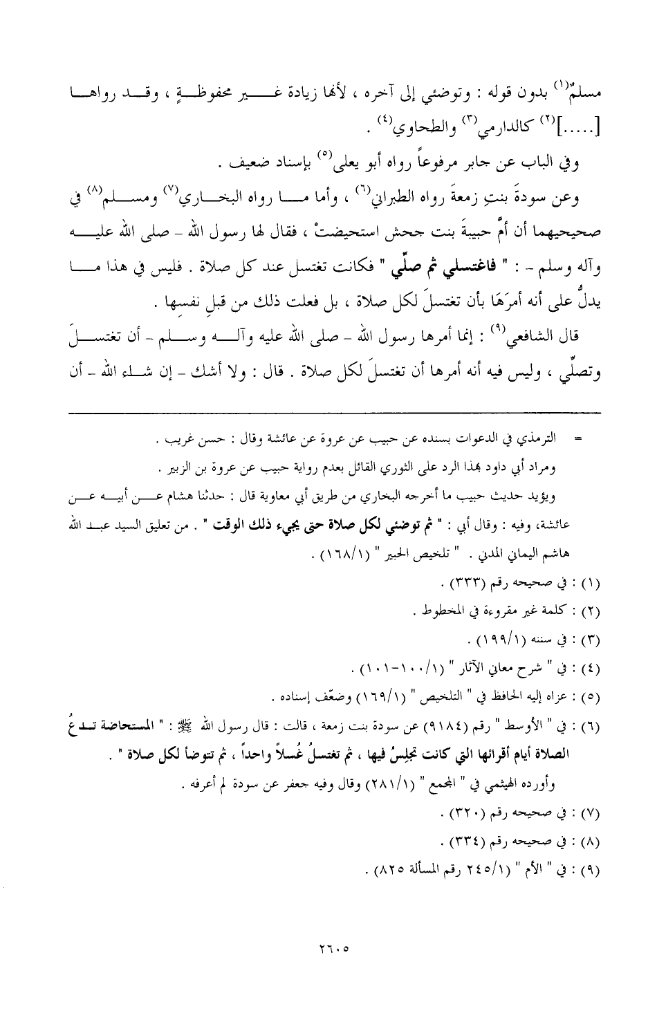 مسلم (¬1) بدون قوله: وتوضئي إلي آخره، لأنها زيادة غير محفوظة، وقد رواها [ ... ] (¬2) كالدرامي (¬3) والطحاوي (¬4).