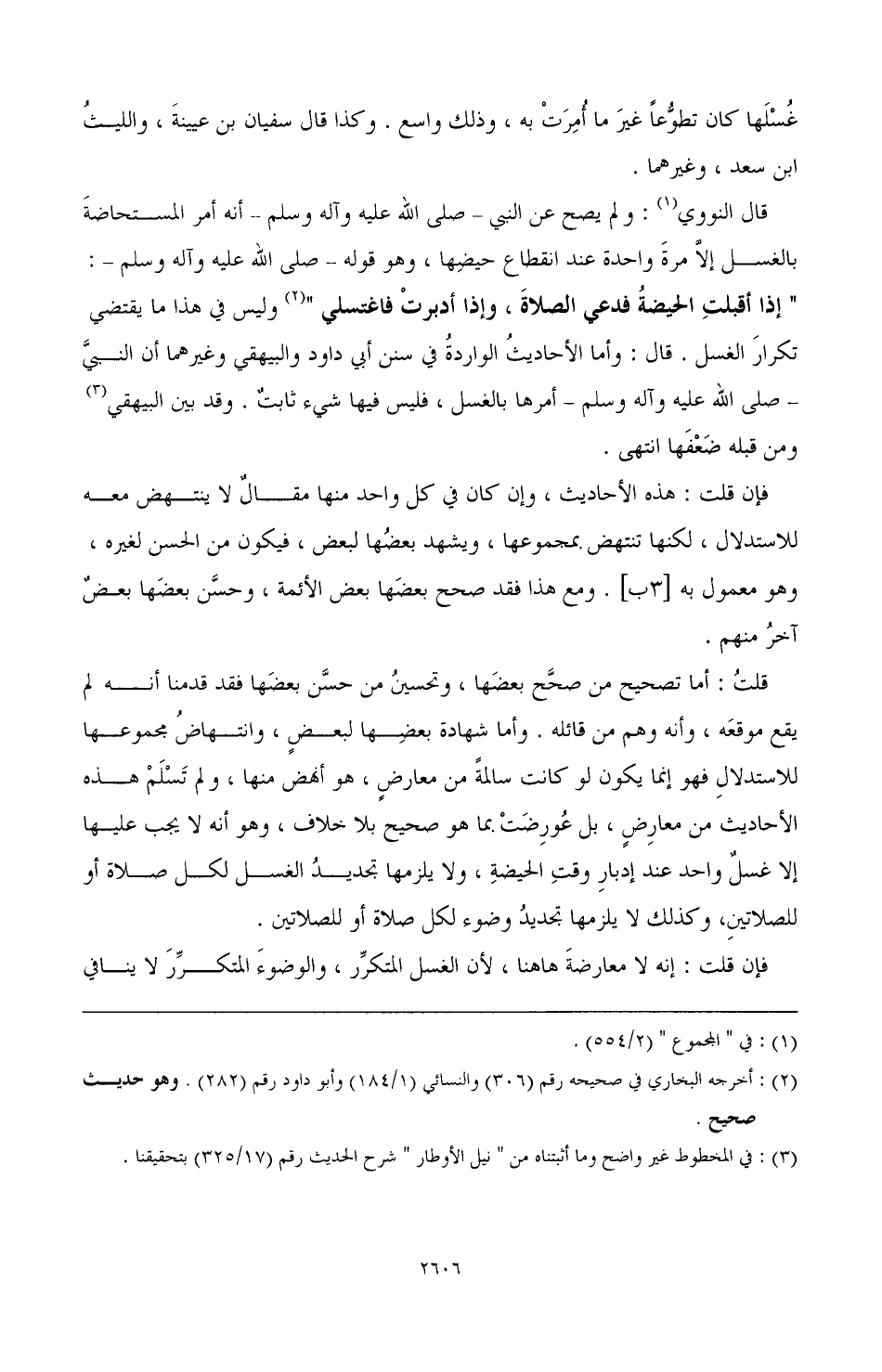 قلت: أما تصحيح من صحح بعضها، وتحسين من حسن بعضها فقد قدمنا أنه لم يقع موقعه، وأنه وهم من قائله. وأما شهادة بعضها لبعض، وانتهاض بعضها للاستدلال فهو إنما يكون لو كانت سالمة من معارض، هو أنهض منها، ولم تسلم هذه الأحاديث من معارض، بل عورضت بما هو صحيح بلا خلاف، وهو أنه لا يجب ىعليها إلا غسل واحد عند إدبار وقت الحيضة، ولا يلزمها تجديد الغسل لكل صلاة أو للصلاتين، وكذلك لا يلزمها تجديد وضوء لكل صلاة أو للصلاتين.