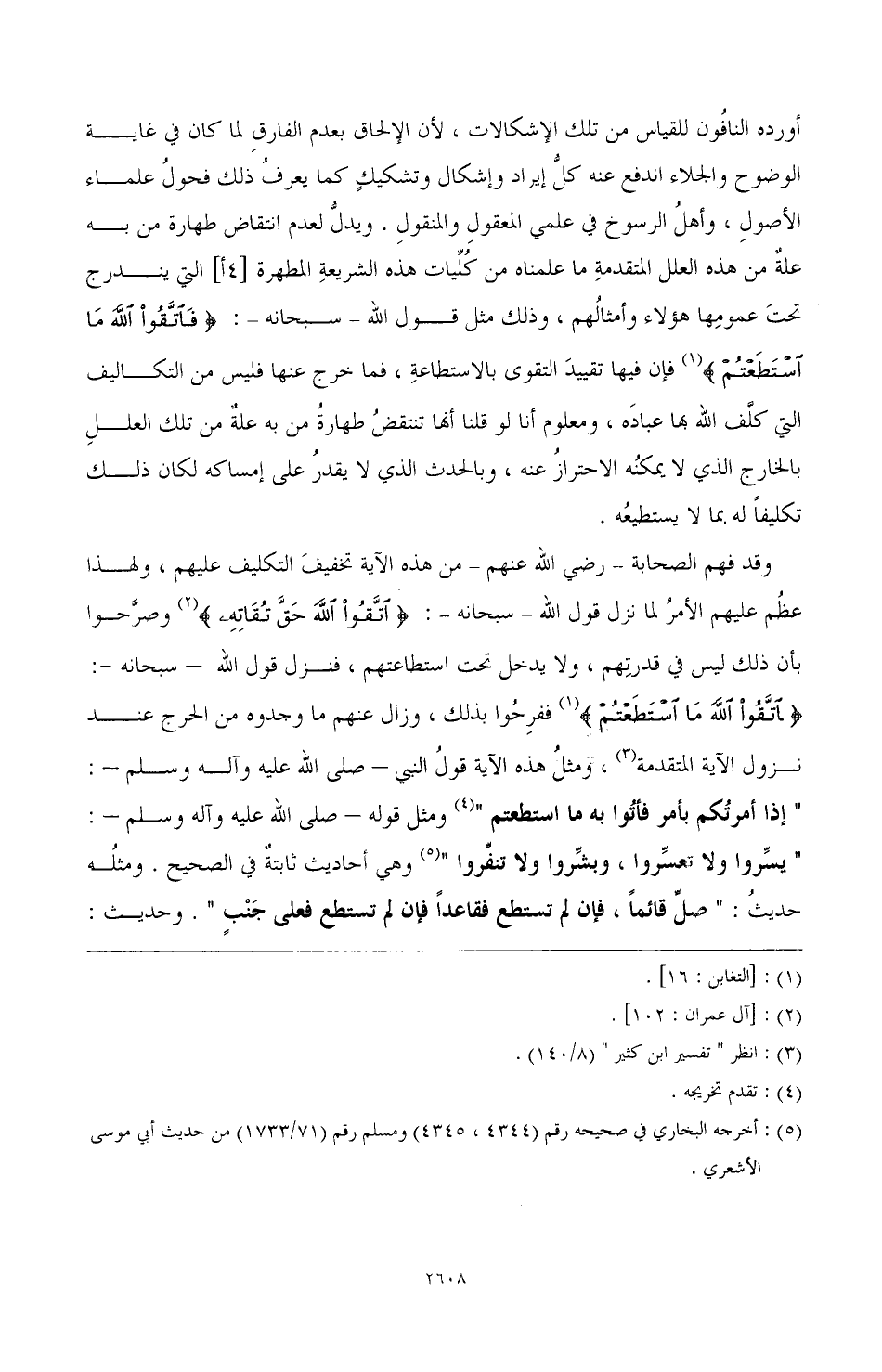 أورده النافون للقياس من تلك الإشكالات، لأن الإلحاق بعدم الفارق لما كان في غاية الوضوح والجلاء اندفع عنه كل إيراد وإشكال وتشكيك كما يعرف ذلك فحول علماء الأصول، وأهل الرسوخ في علمي المعقول والمنقول. ويدل لعدم انتقاض طهارة من به علة من هذه العلل المتقدمة ما علمناه من كليات هذه الشريعة المطهرة [4 أ] التي يندرج تحت عمومها هؤلاء وأمثالهم، وذلك مثل قول الله- سبحانه-: {فاتقوا الله ما استطعتم} (¬1) فإن فيها تقييد التقوى بالاستطاعة، فما خرج عنها فليس من التكاليف التي كلف الله بها عباده، ومعلوم أنا لو قلنا أنها تنتقض طهارة من به علة من تلك العلل بالخارج الذي لا يمكنه الاحتراز عنه، وبالحدث الذي لا يقدر على إمساكه لكان ذلك تكليفًا له بما لا يستطيعه.