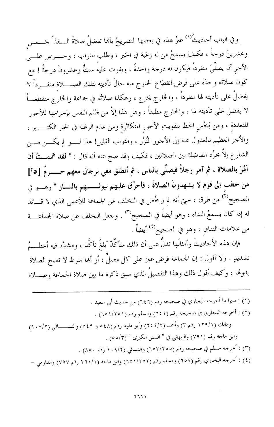 فإن هذه الأحاديث وأمثالها تدل على أن ذلك متأكد أبلغ تأكد، ومشدد فيه أعظم تشديد، ولا أقول: ذلك وهذا التفضيل الذي سبق ذكره ما بين صلاة الجماعة وصلاة