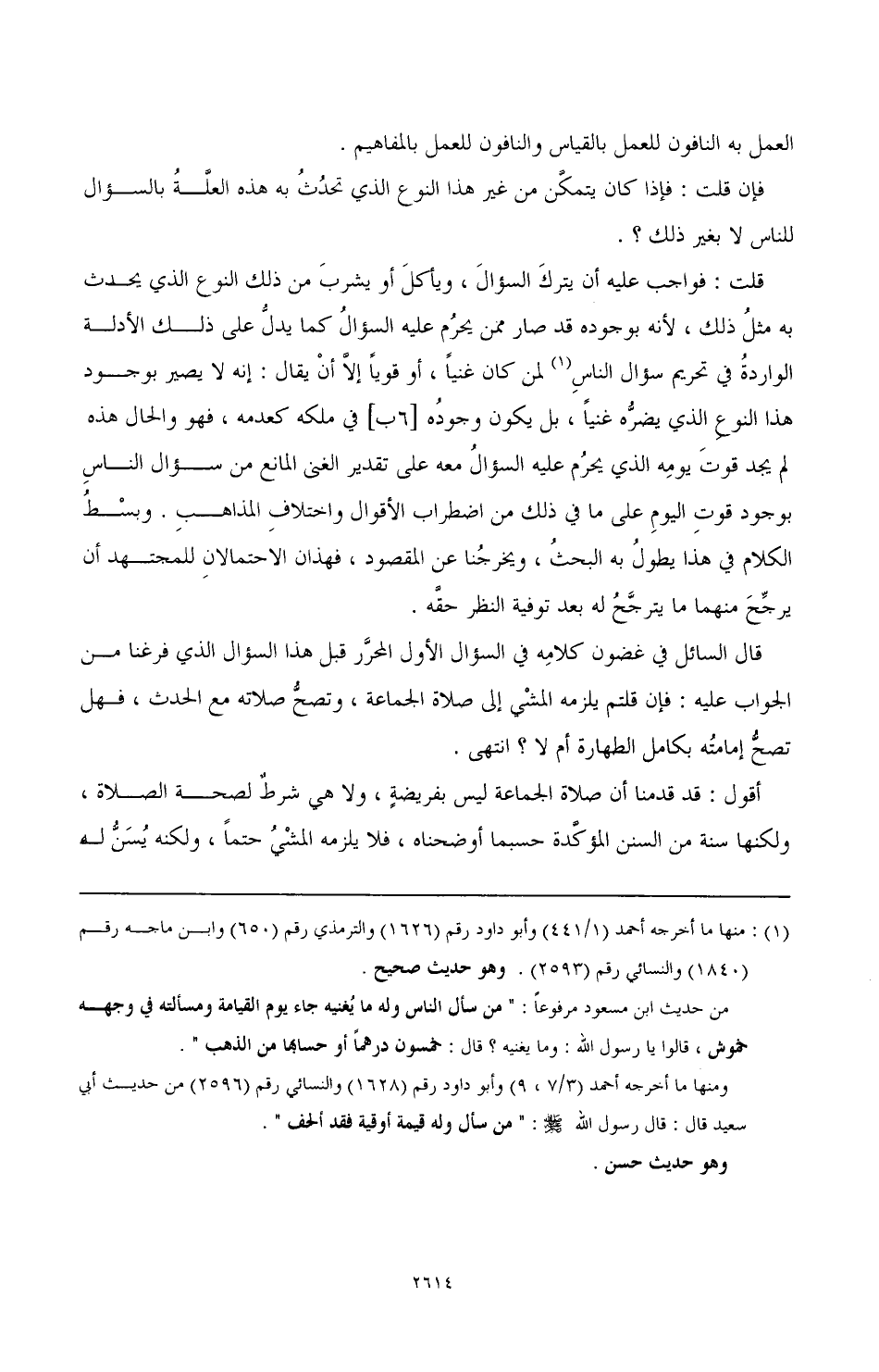 قلت فواجب عليه أن يترك السؤال، ويأكل أو يشرب من ذلك النوع الذي يحدث به مثل ذلك، لأنه بوجوده قد صار ممن يحرم عليه السؤال كما يدل ذلك على الأدلة الواردة في تحريم سؤال الناس (¬1) لمن كان غنيًا، أو قويًا إلا أن يقال: إنه لا يصير بوجود هذا النوع الذي يضره غنيًا، بل يكون وجوده [6ب] في ملكه كعدمه، فهو والحال هذه لم يجد قوت يومه الذي يحرم عليه السؤال معه على تقدير الغني المانع من سؤال الناس بوجود قوت اليوم على ما في ذلك من اضطراب الأقوال واختلاف المذاهب. وبسط الكلام في هذا يطول به البحث، ويخرجنا عن المقصود، فهذان الاحتمالان للمجتهد أن يرجح منهما ما يترجح له بعد توفيه النظر حقه.