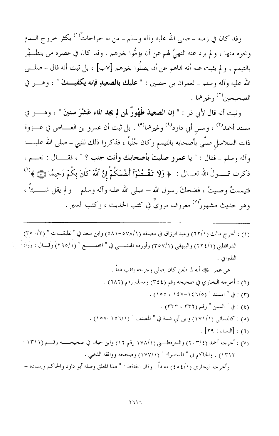 وثبت أنه قال لأبي ذر: «إن الصعيد طهور لمن لم يجد الماء عشر سنين»، وهو في مسند أحمد (¬3)، وسنن أبي داود (¬4) وغيرهما (¬5). بل ثبت أن عمرو بن العاص في غزوة ذات السلاسل صلى بأصحابه بالتيمم وكان جنبًا، فذكروا ذلك للنبي- صَلَّى اللهُ عَلَيْهِ وَآلِهِ وَسَلَّمَ- فقال: «يا عمرو صليت بأصحابك وأنت جنب؟»، فقال: نعم، ذكرت قول الله تعالى: {ولا تقتلوا أنفسكم إن الله كان بكم رحيمًا} (¬6) فتيممت وصليت، فضحك رسول الله- صَلَّى اللهُ عَلَيْهِ وَآلِهِ وَسَلَّمَ- ولم يقل شيئًا، وهو حديث مشهور (¬7) معروف مروي في كتب الحديث، وكتب السير.