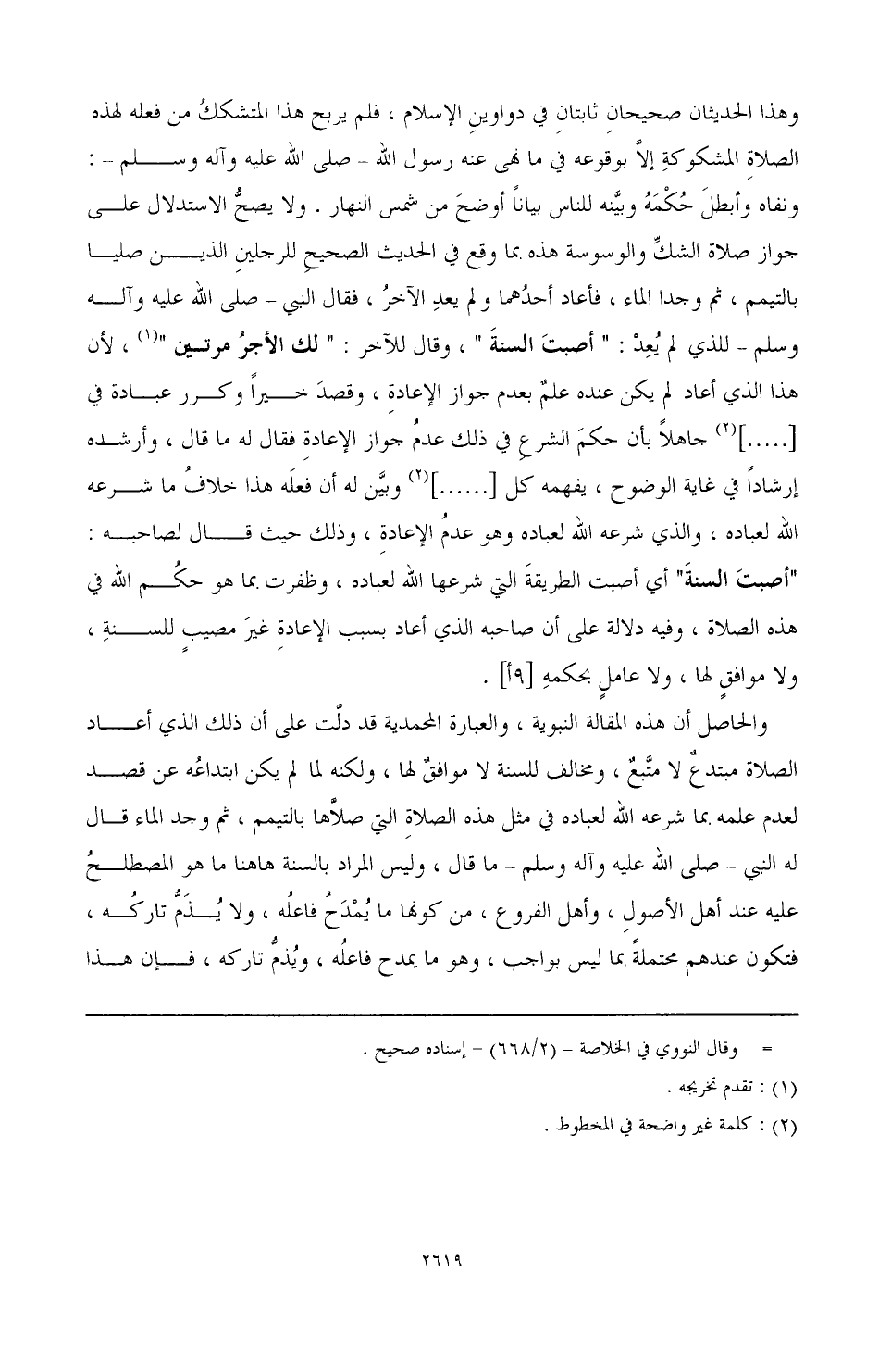 وهذان الحديثان صحيحان ثابتان في دواوين الإسلام، فلم يربح هذا المتشكك من فعله لهذه الصلاة المشكوكة إلا بوقوعه في ما نهى عنه رسول الله- صَلَّى اللهُ عَلَيْهِ وَآلِهِ وَسَلَّمَ-: ونفاه وأبطل حكمه وبيينه للناس بيانًا أوضح من شمس النهار. ولا يصح الاستدلال على جواز صلاة الشك والوسوسة هذه بما وقع في الحديث الصحيح للرجلين الذين صليا بالتيمم، ثم وجدا الماء، فأعاد أحدهما ولم يعد الآخر، فقال النبي- صَلَّى اللهُ عَلَيْهِ وَآلِهِ وَسَلَّمَ- للذي لم يعد: «أصبت السنة»، وقال للآخر: «لك الأجر مرتين» (¬1)، لأن هذا الذي أعاد لم يكن عنده علم بعدم جواز الإعادة، وقصد خيرًا وكرر عبادة في [ ... ] (¬2) جاهلًا بأن حكم الشرع في ذلك عدم جواز الإعادة فقال له ما قال، وأرشده إرشادًا في غاية الوضوح، يفهمه كل [