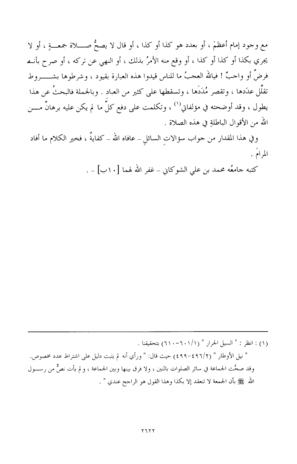 مع وجود إمام أعظم، أو بعدد هو كذا أو كذا، أو قال لا يصح صلاة جمعة، أو لا يجري بكذا أو كذا أو كذا، أو وقع منه الأمر بذلك، أو النهي عن تركه، أو صرح بأنه فرض أو واجب! فيالله العجب ما للناس قيدوا هذه العبارة بقيود، وشرطوها بشروط تقلل عددها، وتقصر مددها، وتقسطها على كثير من العباد. وبالجملة فالبحث عن هذا يطول، وقد أوضحته في مؤلفاتي (¬1)، وتكلمت على دفع ما لم يكن عليه برهان من الله من الأقوال الباطلة في هذه الصلاة.