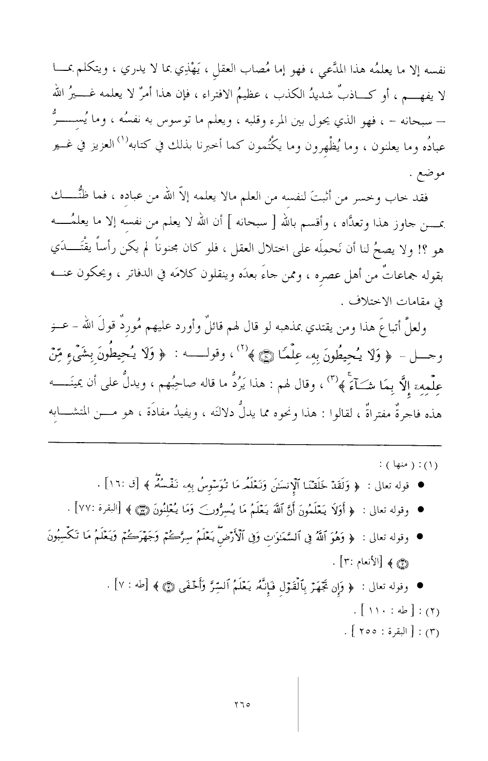 فقد خاب وخسر من أثبت لنفسه من العلم ما لا يعلمه إلا الله من عباده، فما ظنك بمن جاوز هذا وتعداه، وأقسم بالله [سبحانه] أن الله لا يعلم من نفسه إلا ما يعلمه هو؟! ولا يصح لنا أن نحمله على اختلال العقل، فلو كان مجنونا لم يكن رأسا يقتدي بقوله جماعات من أهل عصره، وممن جاء بعده وينقلون كلامه في الدفاتر، ويحكون عنه في مقامات الاختلاف.