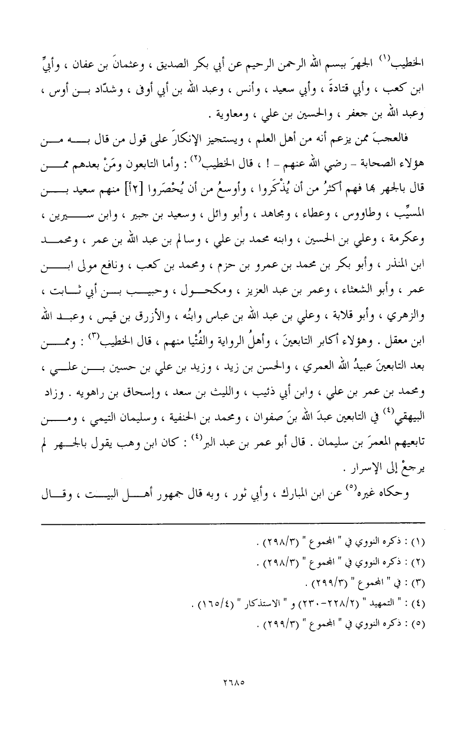 فالعجب ممن يذعم يزعم أنه من أهل العلم ويستجيز والإنكار على قوم من قال به من هؤلاء الصحابة - رضي الله عنهم -!، قال الخطيب (¬2): وأما التابعون ومن بعدهم ممن قال بالجهر بها فهم أكثر من أن يذكروا وأوسع من أن يحصروا (2أ) ومنهم سعيد بن المسيب، وطاووس، وعطاء، ومجاهد، وأبو وائل، وسعيد بن جبير، وابن سيرين، وعكرمة، وعلي بن الحسين، وابنه محمد بن علي، وسالم بن عبد الله عمر، ومحمد بن المنذر، وأبو بكر بن محمد بن عمرو بن حزم، ومحمد بن كعب، ونافع مولى ابن عمر، وأبو الشعثاء، وعمر بن عبد العزيز، مكحول، وحبيب بن أبي ثابت، الزهري، وقلابة، وعلي بن عبد الله بن عباس وأبنه، والأزرق بن قيس، وعبد الله بن معقل. وهؤلاء أكابر التابعين، وأهل الرواية والفتيا منهم، قال الخطيب (¬3): وممن بعد التابعين عبيد الله العمري، والحسن بن زيد، وزيد بن علي بن حسين بن علي، ومحمد بن عمر بن علي، وأبن أبي زئيب، والليث بن سعد، وإسحاق بن راهويه. وزاد البيهقي (¬4) في التابعين عبد الله بن صفوان، ومحمد بن الحنفية، وسليمان التيمي ومن تبعهم المعمر بن سليمان. قال أبو عمر بن عبد البر (¬5): كان ابن وهب يقول بالجهر لم يرجع الإسرار.