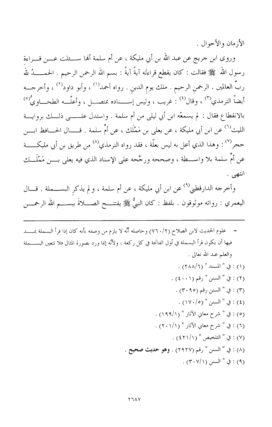 وروى ابن جريج عن عبد الله بن أبي مليكه، عن أ سلمة أنها سئلت عن قراءة رسول الله _صَلَّى اللهُ عَلَيْهِ وَسَلَّمَ_ فقالت: كان يقطع قراءته آية آية: بِسْمِ اللَّهِ الرَّحْمَنِ الرَّحِيمِ. الْحَمْدُ لِلَّهِ رَبِّ الْعَالَمِينَ. الرَّحْمَنِ الرَّحِيمِ. مَالِكِ يَوْمِ الدِّينِ. رواه أحمد (¬1)، وأبو داود (¬2) وأخرجه أيضًا الترمزي (¬3)، قال (¬4): غريب، وليس إسناده بمتصل، وأعله الطحاوي (¬5) بالانقطاع فقال: لم يسمعه أبن أبي ليلى من أم سلمة. واستدل على ذلك برواية الليث (¬6) عن ابن أبي مليكة، عن يعلي بن مملك، عن أم سلمة. قال الحافظ ابن حجر (¬7) وهذا الذي أعل به ليس بعلة، فقد رواه الترمذي (¬8) من طريق ابن أبي مليكة عن أم سلمة بلا واسطة، وصححه ورجحه على الإسناد الذي فيه يعلى بن مملك انتهى.