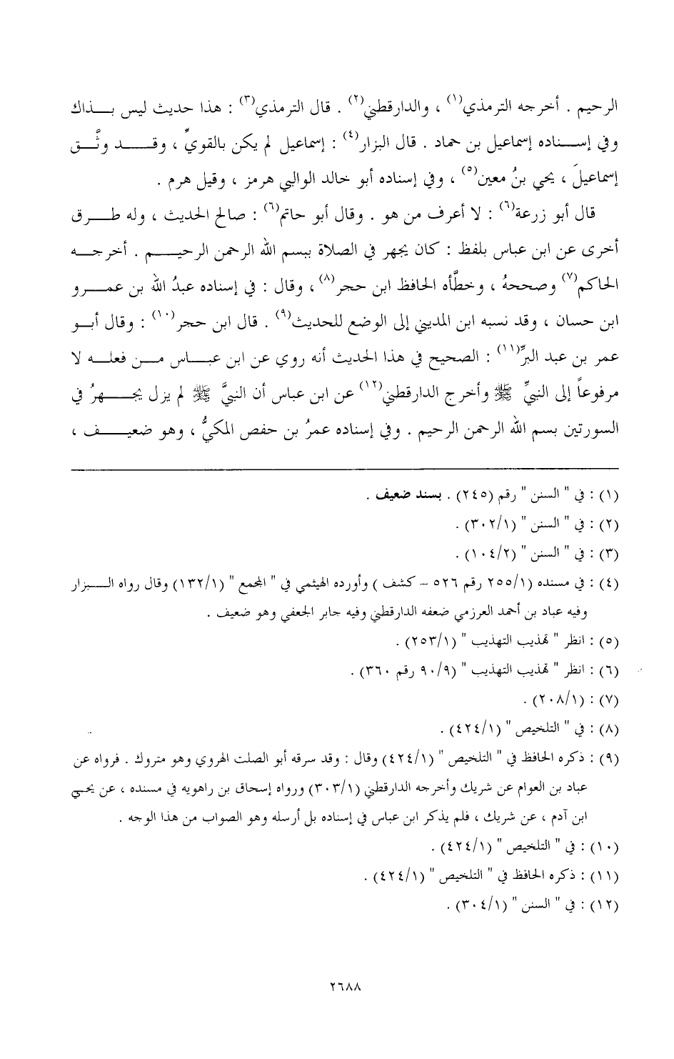 (1). (¬5) انظر"تهذيب التهذيب (9 رقم360). (¬6) انظر"تهذيب التهذيب (9 رقم360). (¬7) (1) وصححه، وخطأه الحافظ ابن الحجر (¬8) ذكره الحافظ في "التلخيص" (1) وقال: وقد سرقه أبو الصلت الهروي وهو متروك، فرواه عن عباد بن العوام عن شريك وأخرجه الدارقطني (1) ورواه إسحاق بن راهويه في مسنده، عن يحيى بن آدم، عن شريك، فلم يذكر ابن عباس في إسناده أرسله وهوالصواب من هذا الوجه. (¬9) في "التلخيص" (1). (¬10): الصحيح في هذا الحديث أنه روي عن ابن عباس من فعله لا مرفوعًا إلى النبي _صَلَّى اللهُ عَلَيْهِ وَسَلَّمَ_ وأخرج الدارقطني (¬11) عن ابن عباس أن النبي _صَلَّى اللهُ عَلَيْهِ وَسَلَّمَ_ لم يزل يجهر في السورتين بسم الله الرحمن الرحيم. وفي إسناده عمر بن حفص المكي، وهو ضعيف،