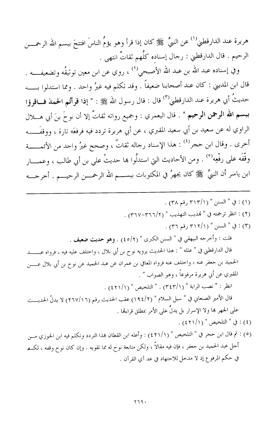 هريرة عند الدارقطني (¬1) عن النبي _صَلَّى اللهُ عَلَيْهِ وَسَلَّمَ_ كان إذا قرأ وهو يؤم الناس افتتح بسم الله الرحمن الرحيم. قال الدارقطني: رجال إسناده كلهم ثقات انتهى.