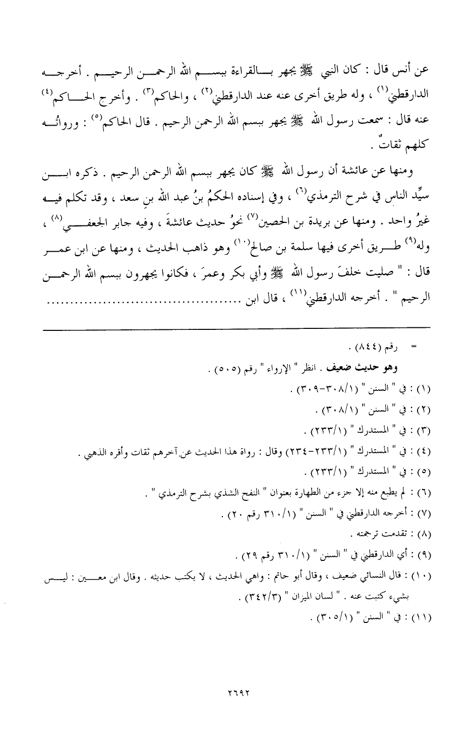 ومنها عن عائشة أن رسول الله _صَلَّى اللهُ عَلَيْهِ وَسَلَّمَ_ كان يجهر ببسم الله الرحمن الرحيم. ذكره ابن سيد الناس في شرح الترمذي (¬6)، وفي إسناده الحكم بن عبد الله بن سعد، وقد تكلم فيه غيرواحد. ومنها عن بريدة بن الحصين (¬7) نحو حديث عائشة، وفي جابر الجعفي (¬8)، وله (¬9) طريق أخرى فيها سلمة بن صالح (¬10) وهو ذاهب الحديث، ومنها عن ابن عمر قال: " صليت خلف رسول الله _صَلَّى اللهُ عَلَيْهِ وَسَلَّمَ_ وأبي بكر وعمر، فكانوا يجهرون ببسم الله الرحمن الرحيم ". أخرجه الدارقطني (¬11)، قال ابن ......................