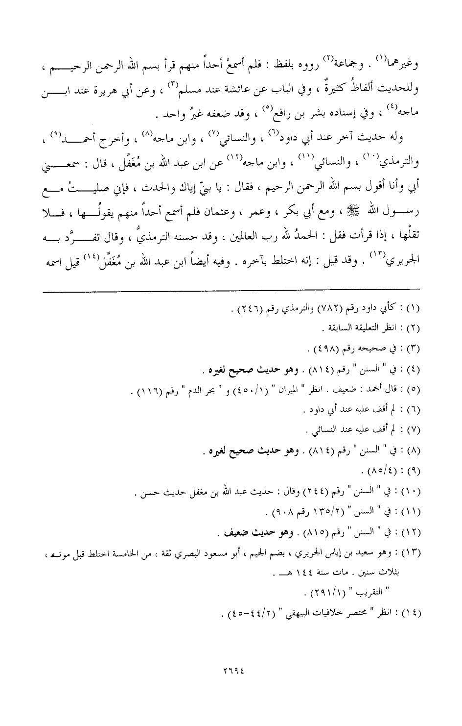 وله حاديث آخر عند أبي دواد (¬6)، والنسائي (¬7) وابن ماجه (¬8)، وأخرج أحمد (¬9) والترمذي (¬10)، والنسائي (¬11)، وابن ماجه (¬12) عن ابن عبد الله بن مغفل، قال: سمعني أبي وأنا أقول بسم الله الرحمن الرحيم، فقال: يابني إياك والحدث، فإني صليت مع رسول الله _صَلَّى اللهُ عَلَيْهِ وَسَلَّمَ_، ومع أبي بكر، وعمر، وعثمان فلم أسمع أحدا منهم يقولها، فلا تقلها، إذا قرأت فقل: الحمد لله رب العالمين، وقد حسنه الترمذي، وقال تفرد به الجريري (¬13) وقد قيل: إنه اختلط بآخره. وفيه ايضا ابن عبد الله بن مغفل (¬14) قيل اسمه