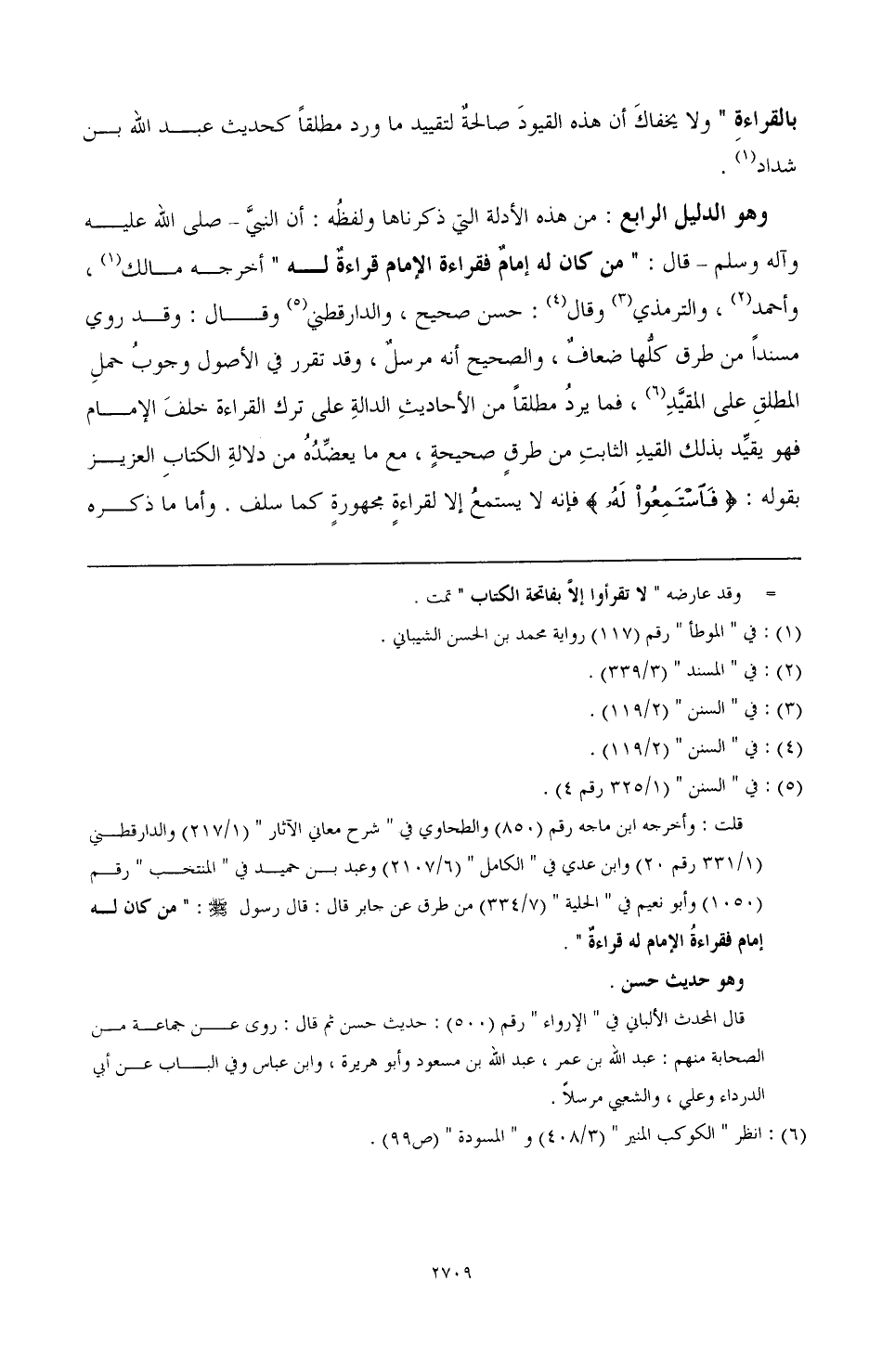 وهو الدليل الرابع: من هذه الأدلة التي ذكرناها ولفظه: أن النبي - صَلَّى اللهُ عَلَيْهِ وَآلِهِ وَسَلَّمَ- قال: " من كان له إمام فقراءة الإمام قراءة له " أخرجه مالك (¬2) وأحمد (¬3)، والترمذي (¬4) وقال (¬5): حسن صحيح: والدارقطني (¬6) وقال: وقد روي مسندا من طرق كلها ضعاف، والصحيح أنه مرسل، وقد تقرر في الأصول وجوب حمل المطلق على المقيد (¬7)، فما يرد مطلقا من الأحاديث الدالة على ترك القراءة خلف الإمام فهو يقيد بذلك القيد الثابت من طرق صحيحة، مع ما يعضده من دلالة الكتاب العزيز بقوله: (فَاسْتَمِعُوا لَهُ) فإنه لا يستمع إلا لقراءة مجهورة كما سلف. وأما ماذكره