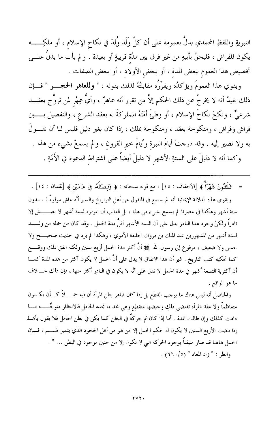 النبوية واللفظ المحمدي يدل بعمومه على أن كل ولد ولد في نكاح الإسلام، أو ملكه يكون للفراش، فليحق بأبيه من غيرفرق بين مدة قريبة أو بعيدة، ولم يأتي ما يدل على تخصيص هذا العموم ببعض المدة، أو ببعض الأولاد، أو ببعض الصفات.