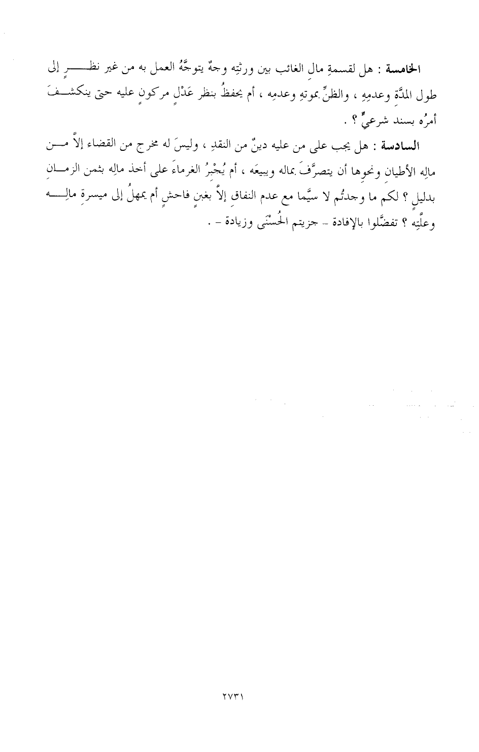 الخامسة: هل لقسمة مال الغائب بين ورثته وجه يتوجه العمل به من غير نظر إلى طول المدة وعدمه، والظن بموته وعدمه، أم يحفظ بنظر عدل مر كون عليه حتى ينكشف أمره يسند شرعي؟.