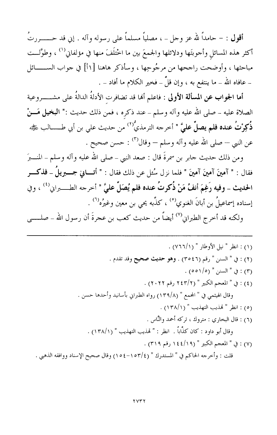 أما الجواب عن المسألة الأولى: فاعلم انها قد تضافرت الأدلة الدالة على مشروعية الصلاة عليه - صَلَّى اللهُ عَلَيْهِ وَآلِهِ وَسَلَّمَ - عند ذكره، فمن ذلك حديث: "البخيل من ذكرت عنده فلم يصل علي" أخرجه التزمذي (¬2) من حديث علي بن أبي طالب رضي الله عنه عن النبي - صَلَّى اللهُ عَلَيْهِ وَآلِهِ وَسَلَّمَ - وقال (¬3): حسن صحيح.