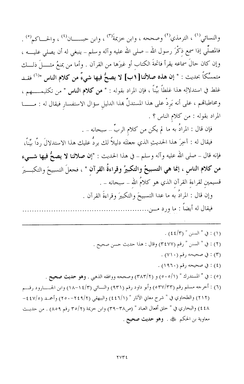 (¬6) أخرجه مسلم رقم (33) وأبو داود رقم (931) والنسائي (3 - 18) وابن الجارود رقم (212) والطحاوي في "شرح معاني الآثار" (1) والبيهقي (2 - 250) وأحمد (5 - 448) والبخاري في "خلق أفعال العباد" (ص 38 - 39) وابن خزيمة (2 رقم 859). من حديث معاوية بن الحكم رضي الله عنه. وهو حديث صحيح.