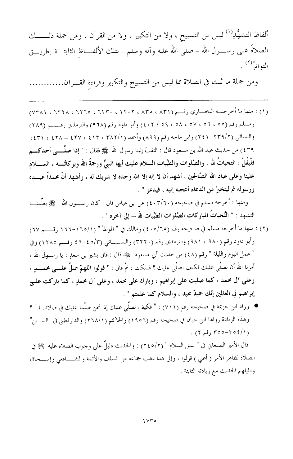 ألفاظ التشهد (¬1) ليس من التسبيح، ولا من التكبير، ولا من القرآن. ومن جملة ذلك الصلاة على رسول الله - صَلَّى اللهُ عَلَيْهِ وَآلِهِ وَسَلَّمَ - بتلك الألفاظ الثابتة بطريق التواتر (¬2).