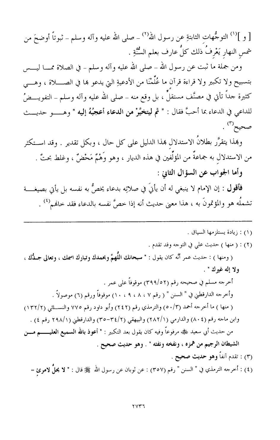 ومن جملة ما ثبت عن رسول الله - صَلَّى اللهُ عَلَيْهِ وَآلِهِ وَسَلَّمَ - في الصلاة مما ليس بتسبيح ولا تكبير ولا قراءة قرآن ما علمنا من الأدعيه التي يدعوها في الصلاة، وهي كثيرة جدا تأتي في مصنف مستقل، بل وقع منها - صَلَّى اللهُ عَلَيْهِ وَآلِهِ وَسَلَّمَ - التفويض للداعي في الدعاء بما أحب فقال: "ثم لا يتخير من الدعاء أعجبه إليه " وهو حديث صحيح. (¬3)