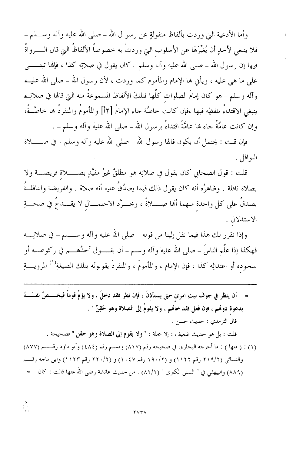 وأما الأدعية التي وردت بألفظ منقوله عن النبي - صَلَّى اللهُ عَلَيْهِ وَآلِهِ وَسَلَّمَ - فلا ينبغي لأحد أن يغيرها عن الأسلوب التي وردت به خصوصا الألفاظ التي قال الرواة فيها إن رسول الله- صَلَّى اللهُ عَلَيْهِ وَآلِهِ وَسَلَّمَ - كان يقول في صلاته كذا، فإنها تبقي على ما هو عليه، ويأتي بها الإمام والمأموم كما وردت، لأن رسول الله - صَلَّى اللهُ عَلَيْهِ وَآلِهِ وَسَلَّمَ - هو كان إمام الصلوات كلها فتلك الألفاظ المسموعة منه التي قالها في صلاته ينبغي الاقتداء بلفظه فيها، فإن كانت خاصة جاء الإمام [2أ] والمأموم والمنفردبها خاصة، وإن كانت عامة جاء بها عامة اقتداء برسول الله - صَلَّى اللهُ عَلَيْهِ وَآلِهِ وَسَلَّمَ -.