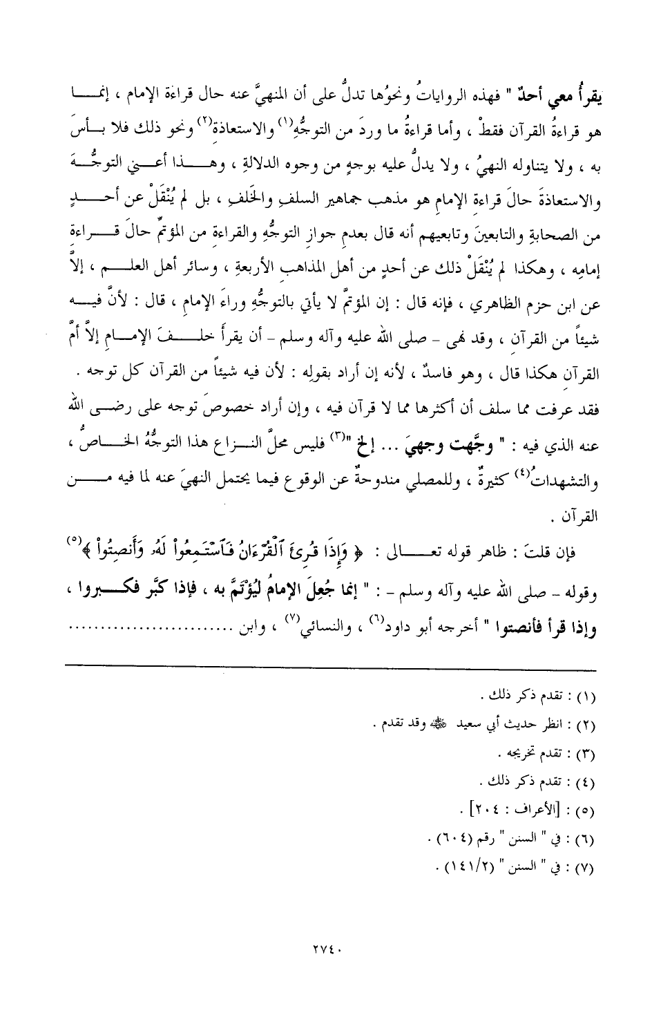 يقرأ معي أحد " فهذه الروايات ونحوها تدل على أن المنهي عنه حال قراءة الإمام، إنما هو قراءة القرآن فقط، وأما قراءة ما ورد من التوجه (¬1) والاستعاذة (¬2) ونحو ذلك فلا بأس به، ولايتناوله النهي، ولا يدل عليه بوجه من وجوه الدلالة، وهذا أعني التوجه والاستعاذة حال قراءة الإمام هو مذهب جماهير السلف والخلف، بل لم ينقل عن أحد من الصحابة والتابعين وتابعيهم أنه قال بعدم جواز التوجه والقراءة من المؤتم حال قراءة إمامه، وهكذا لم ينقل ذلك عن احد من أهل المذاهب الأربعة، وسائر أهل العلم، إلا عن ابن حزم الظاهري، فإنه قال: إن المؤتم لا يأتي بالتوجه وراء الإمام، قال: لأن فيه شيئا من القرآن، وقد نهى- صَلَّى اللهُ عَلَيْهِ وَآلِهِ وَسَلَّمَ - أن يقرأ خلف الإمام إلا أم القرآن هكذا قال، وهو فاسد، لأنه إن أراد قوله: لأن فيه شيئا من القرآن كل توجه.