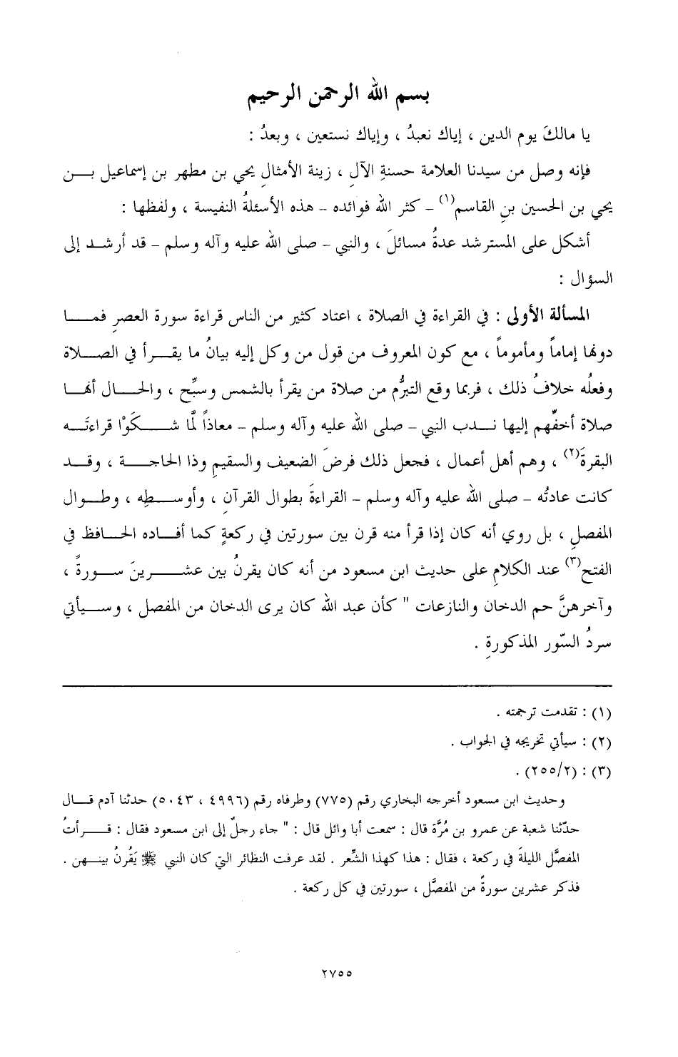 المسألة الأولى: في القراءة في الصلاة، اعتاد كثير من الناس قراءة سورة العصر فما دونها إماما ومأموما، مع كون المعروف من قول من وكل إليه بيان ما يقرأ في الصلاة وفعله خلاف ذلك، فربما وقع التبرم من صلاة من يقرأ بالشمس وسبح، والحال أنها صلاة أخفهم إليها ندب النبي- صَلَّى اللهُ عَلَيْهِ وَآلِهِ وَسَلَّمَ - معاذا لما شكوا قراءته البقرة (¬2)، وهم أهل أعمال، فجعل ذلك فرض الضعيف والسقيم وذا الحاجة، وقد كانت عادته -صَلَّى اللهُ عَلَيْهِ وَآلِهِ وَسَلَّمَ - القراءة بطوال القرآن، وأوسطه، وطوال الفتح (¬3) عند الكلام على حديث ابن مسعود من أنه كان يقرن بين عشرين سورة، وآخرهن حم الدخان والنزعات " كأن عبد الله كان يرى الدخان السور المذكورة. من المفصل، وسيأتي سرد السور المذكورة.