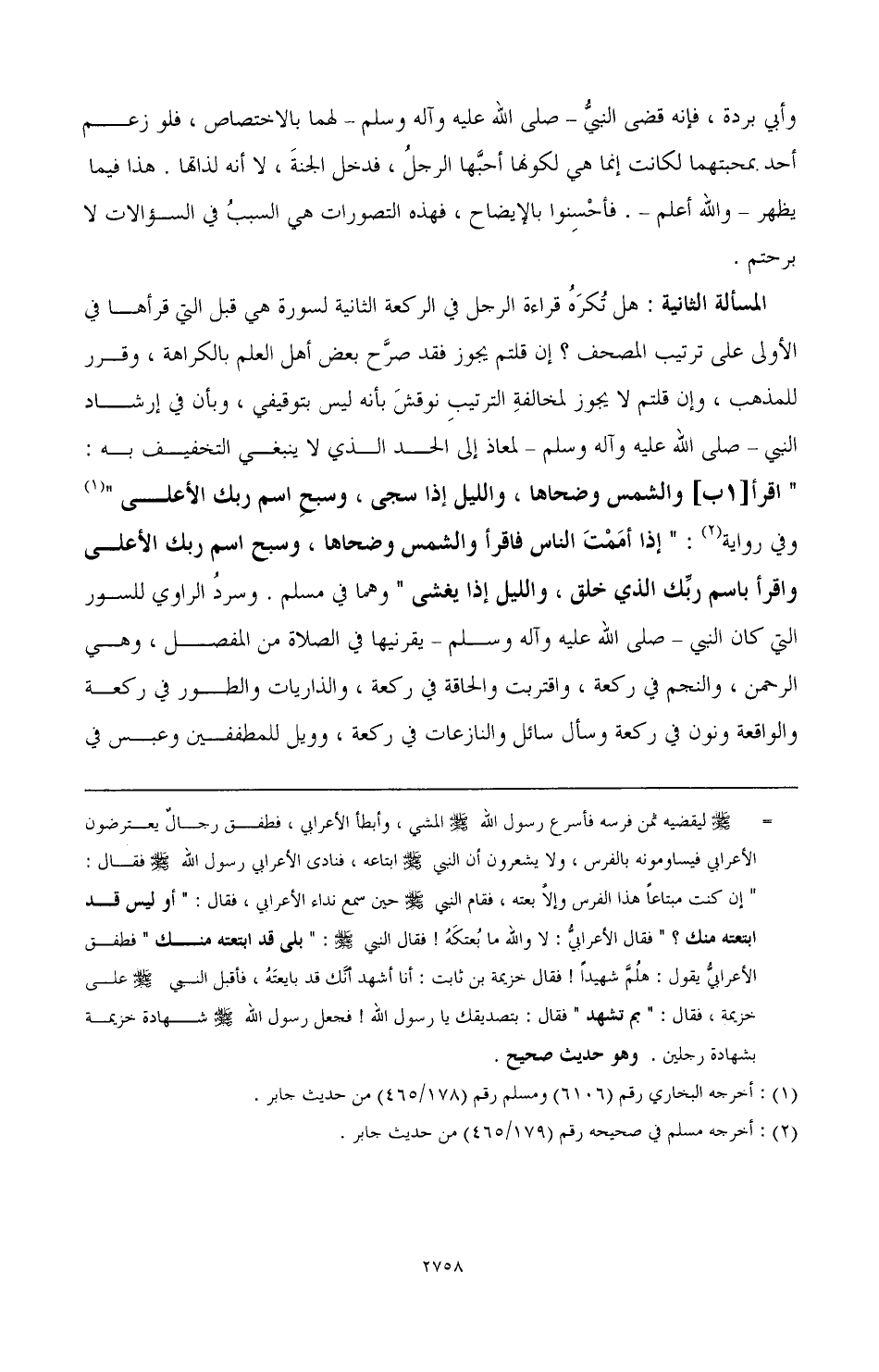 المسألة الثانيه: هل تكره قراءة الرجل في الركعة الثانية لسورة هي قبل التي قرأها في الأولى على ترتيب المصحف؟ إن قلتم لا يجوز فقد صرح بعض أهل العلم بالكراهة، وقرر للمذهب، وأن قلتم لا يجوز لمخالفة الترتيب نوقش بأنه ليس بتوفيقي، وبأن في إرشاد النبي - صَلَّى اللهُ عَلَيْهِ وَآلِهِ وَسَلَّمَ - لمعاذ إلى الحد الذي لا ينبغي التخفيف به: "