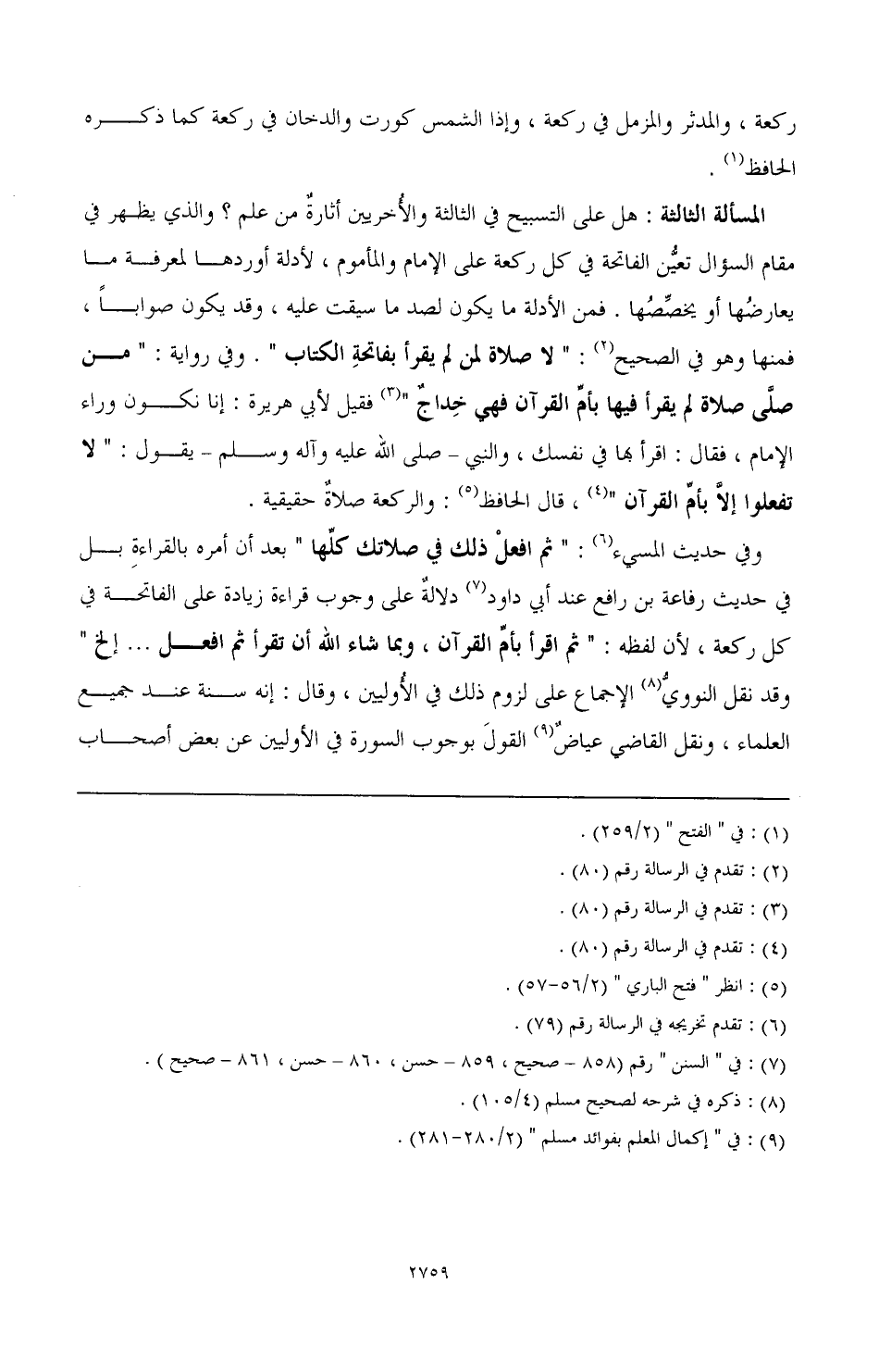 المسألة الثالثة: هل التسبيح في الثالثة والأخريين إثارة من علم؟ والذي يظهر في مقام السؤال تعين الفاتحة في كل ركعة على الإمام والمأموم، لأدلة أوردها لمعرفة ما يعارضها أو يخصصها، فمن الأدلة ما يكون لصد ما سقيت عليه، وقد يكون صوابا، فمنها وهو في الصحيح (¬2): "لا صلاة لمن لم يقرأ بفاتحة الكتاب". وفي رواية: "من صلى صلاة لم يقرأ فيها بأم القرآن فهي خداج " (¬3) فقيل لأبي هريرة: إنا نكون وراء الإمام،، فقال: أقرأ بها في نفسك، والنبي - صَلَّى اللهُ عَلَيْهِ وَآلِهِ وَسَلَّمَ - يقول: "لا تفعلوا إلا بأم القرآن" (¬4)، قال الحافظ (¬5): والركعة صلاة حقيقية.