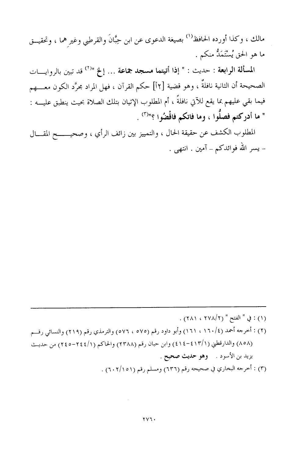 المسألة الرابعة: حديث: "إذا أتيما مسجد جماعة. .. إلخ" (¬2) قد تبين بالروايات الصحيحة أن الثانية نافلة، وهو قضية [2أ] حكم القرآن ن فهل المراد مجرد الكون معهم فيما بقي عليهم بما يقع للآتي نافلة، أم المطلوب الإتيان بتلك الصلاة بحيث ينطبق عليه: "ما ادركتم فصلوا، وما فاتكم فاقضوا؟ " (¬3).